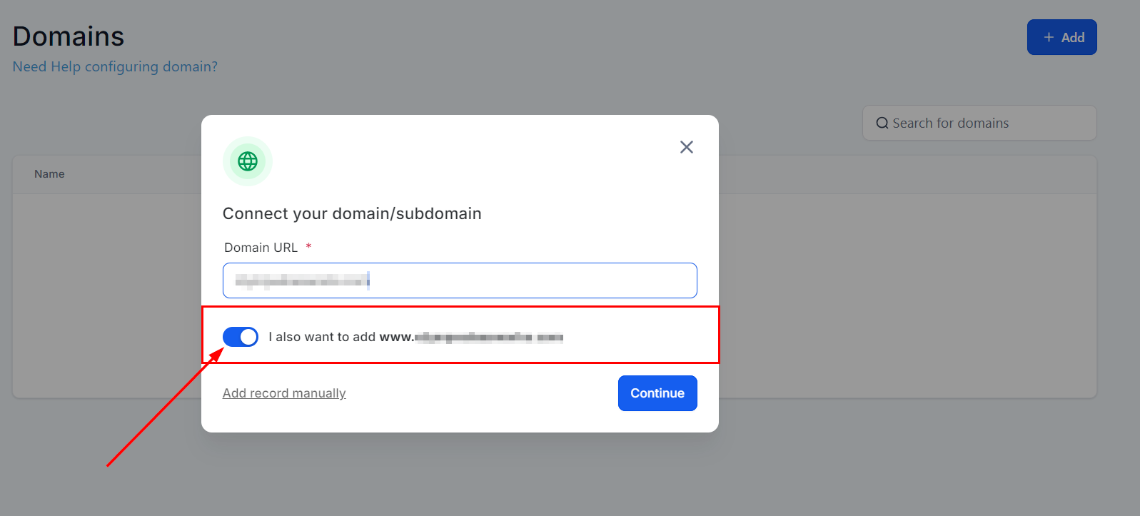 Since this is a root domain, you also have the option to add the "www" subdomain by toggling the option.