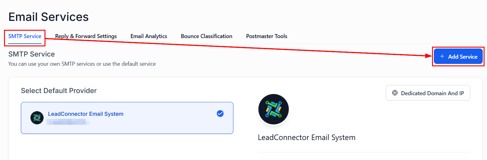 Access the Settings area within your account, and locate the Email Services section. From there, click on the Add Service button to begin the SMTP connection process.