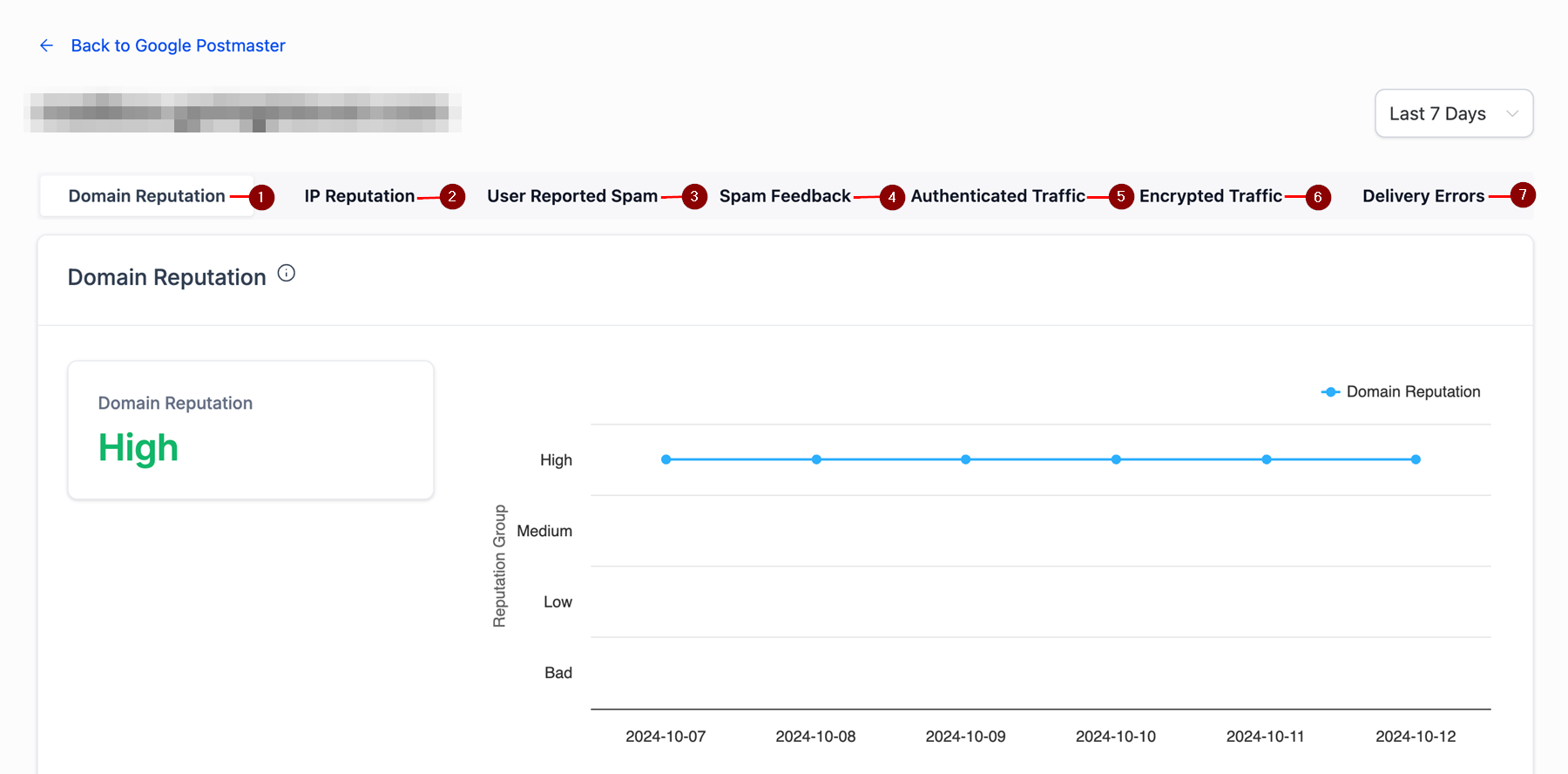 Once connected, your Postmaster metrics will seamlessly integrate into the platform for efficient management. You can view essential details about your dedicated sending domains, including IP and domain reputation, as well as the spam complaint ratio.