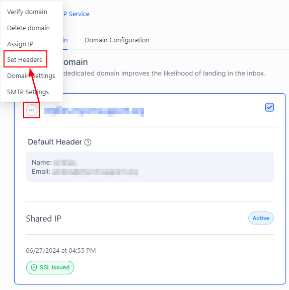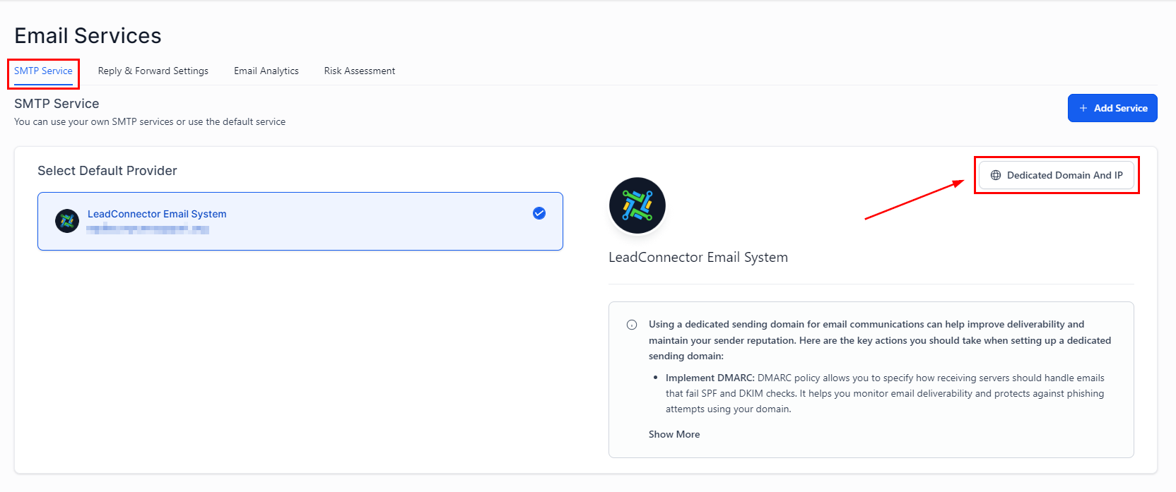 Access the SMTP Service tab inside the Email Services section of your settings. Here click on Dedicated Domain And IP.