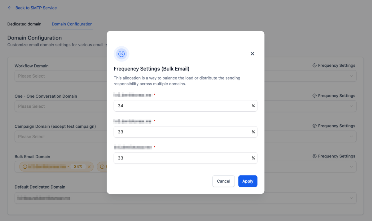 Click on Frequency settings, here you can define the priority for the domain use and the percentage of emails each covers.