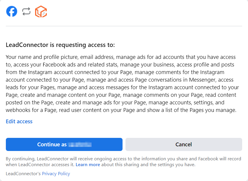 After logging in, you will be presented with a list of requested permissions. For optimal functionality, it is advisable to keep all permissions enabled. However, you can customize your preferences by clicking the "Edit Access" button and adjusting the switches as needed. Select the βContinue asβ button to proceed to the next steps.