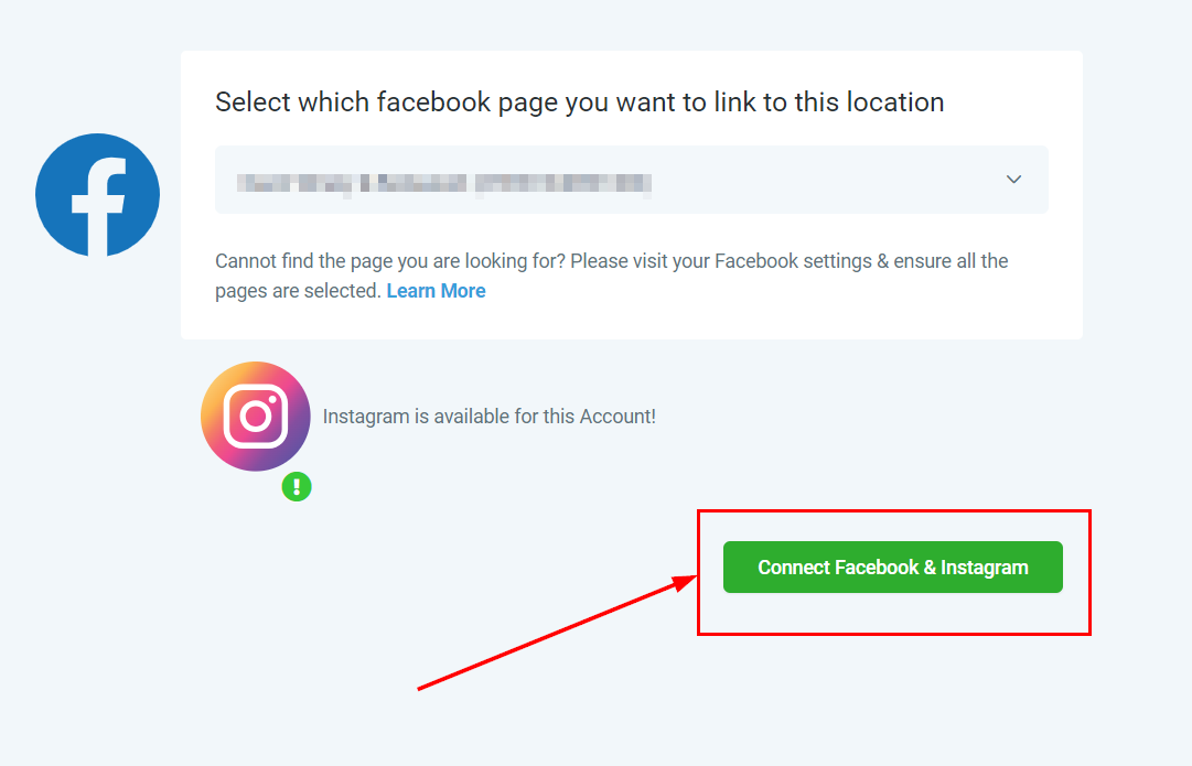 The Instagram business account linked to the selected Facebook page will be identified and available for connection. Click the "Connect Facebook and Instagram" button to finalize the integration.