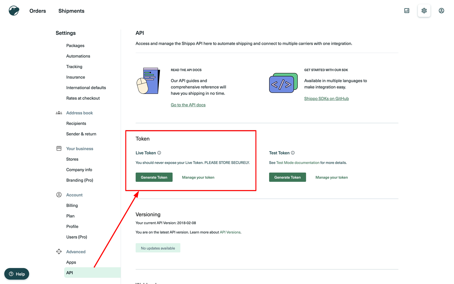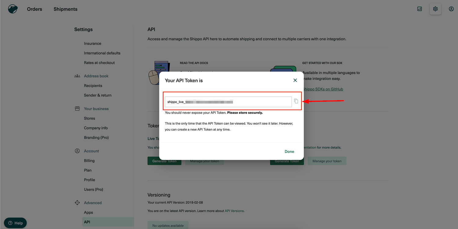 To begin, generate a live token in Shippo. Navigate to Settings > Advanced > API > Live Token. Click โGenerate Live Tokenโ.