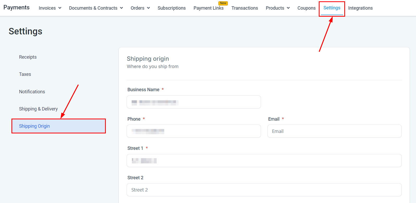 In your eCommerce store's payment section, configure the shipping origin, which will serve as the sender's address when creating orders in Shippo. This can be accessed via Payments > Settings > Shipping Origin. Ensure the address is valid to avoid errors during label creation in Shippo.