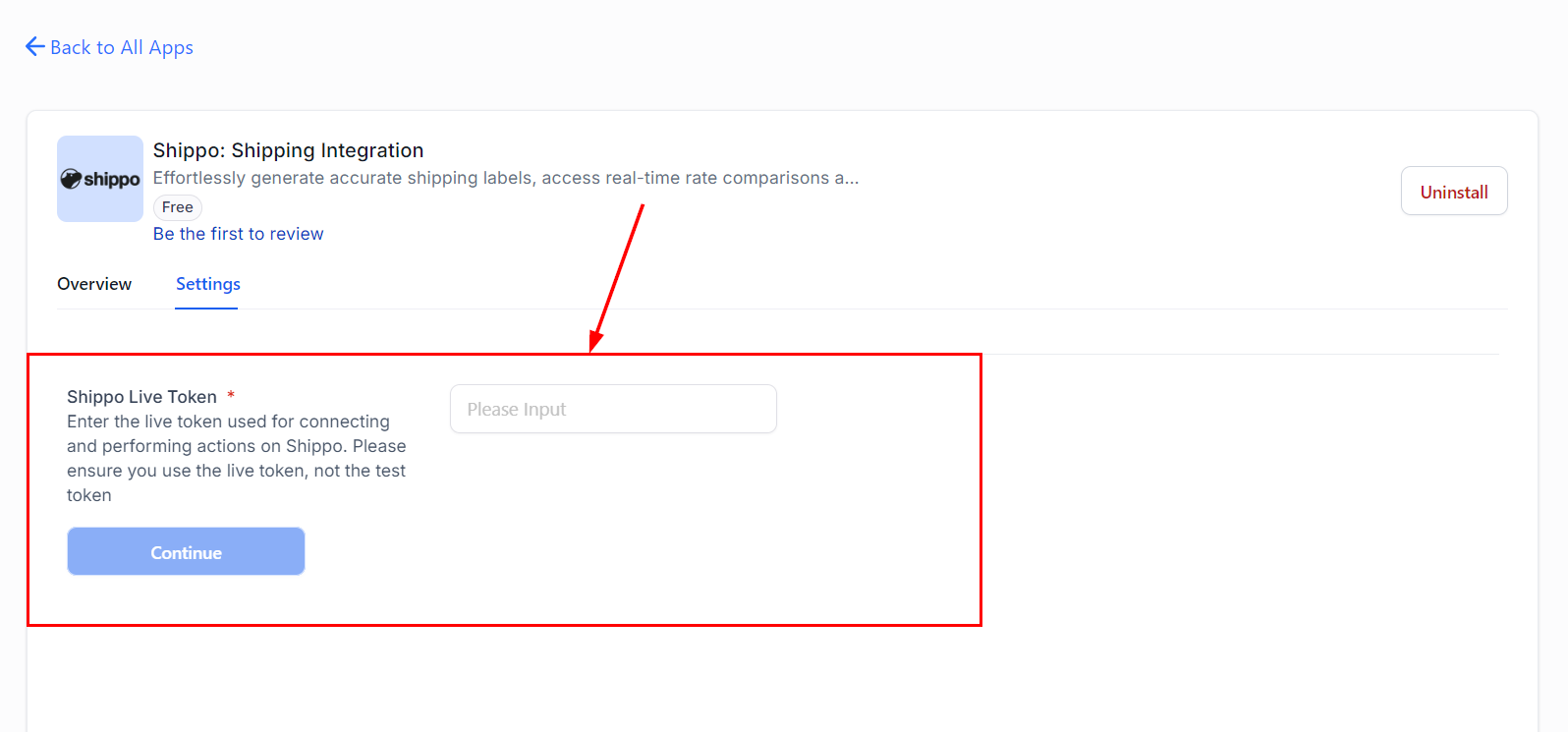 From the Integrations page in Settings, search for and install the Shippo application if prompted. Once installed, input the live token generated in Step 1 to continue.