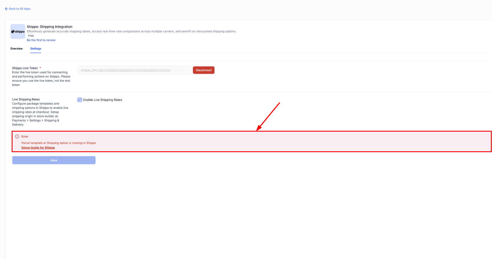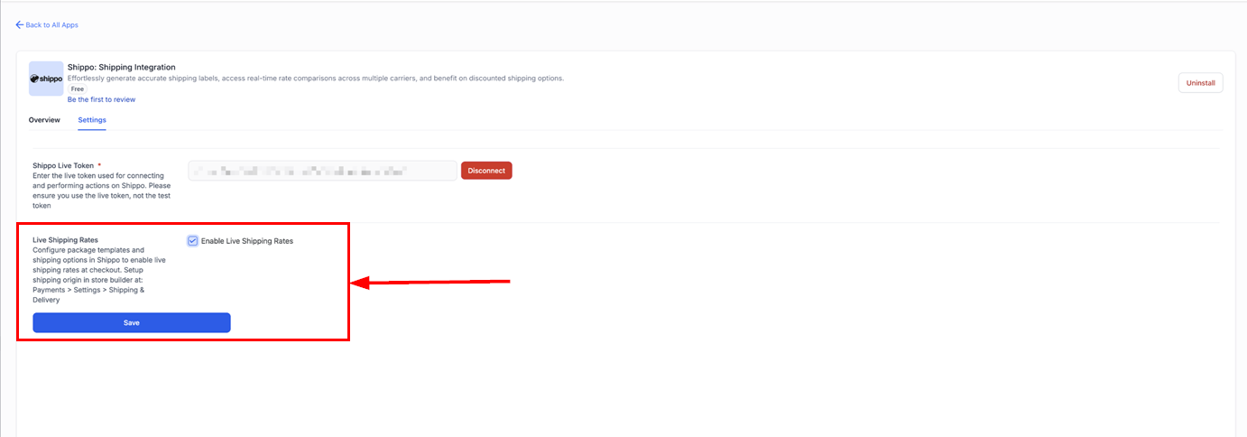 Enable live shipping rates after setting up the package template, shipping origin, and shipping options in Shippo and click Save.
