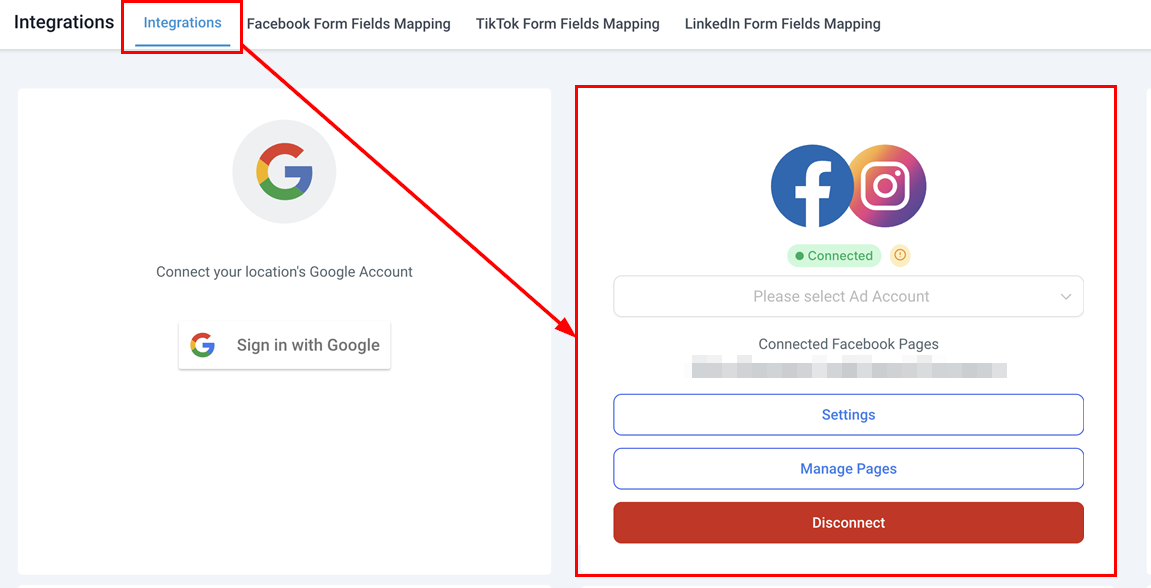 Once completed, go to your Account Settings within our platform > Integrations > Facebook & Instagram to start the setup.