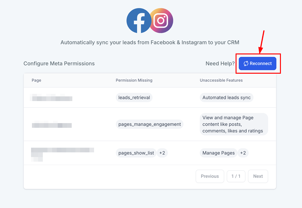 Pages with missing permissions will have an error below the connection. Clicking the Resolve option provides a detailed list of missing permissions for connected pages and the features that are inaccessible due to these missing permissions will be highlighted, giving users a complete understanding of the issue.