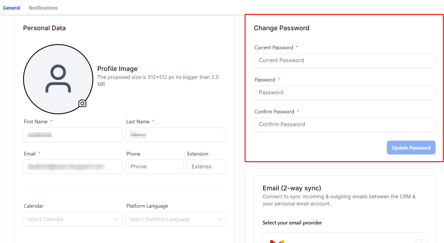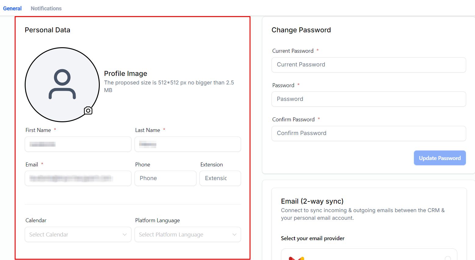 Upload your profile photo and update your contact details, including your first and last name, email, phone number, and extension (if applicable). Additionally, you can select a default calendar and set the platform language within this section.