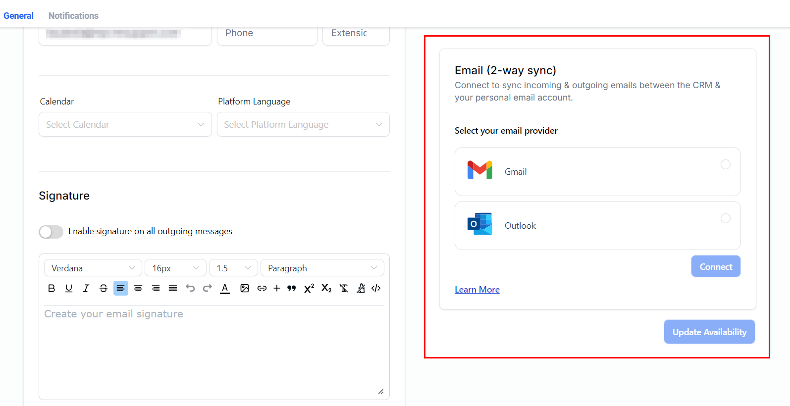 Connect your personal Gmail or Outlook accounts to sync outgoing and incoming emails between the platform and your email accounts, enabling you to send, receive, and track emails seamlessly.