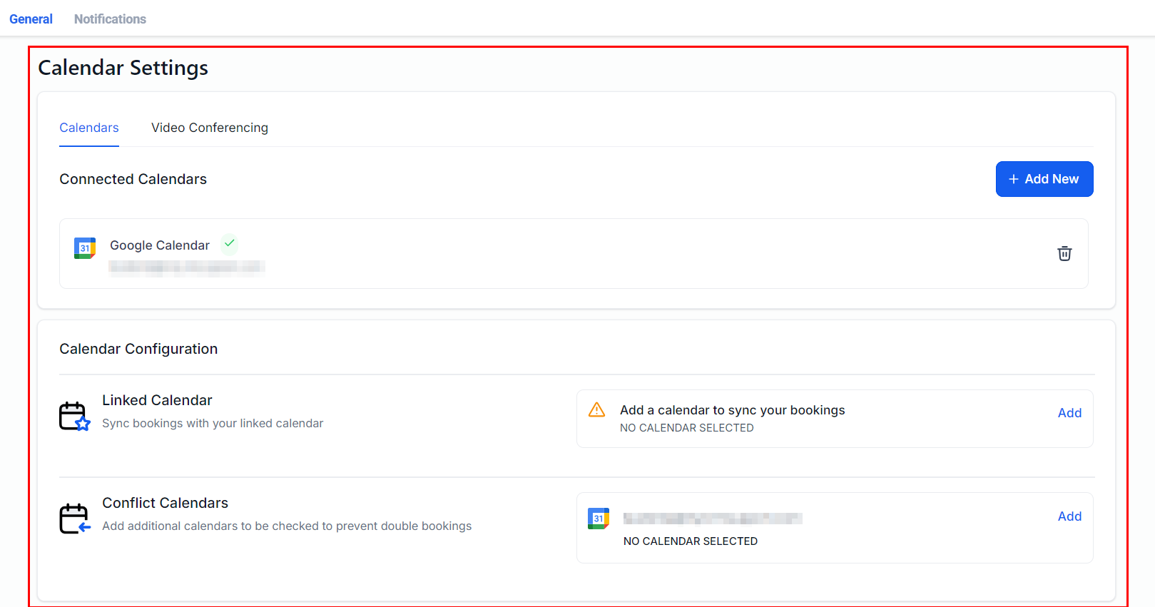 In this section, you can view and connect calendar integrations, manage calendar conflicts, and designate your Primary calendar for scheduling to prevent overlapping events or appointments.