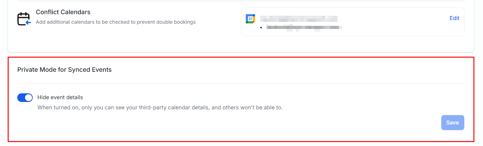 Furthermore, you can keep your third-party calendar details confidential by toggling on the hide event details switch. Enabling this setting ensures that only the user who connected the calendar can view event details, preventing others from accessing them within the platform. This feature is specifically designed to enhance privacy and safeguard third-party calendar events from unauthorized access.