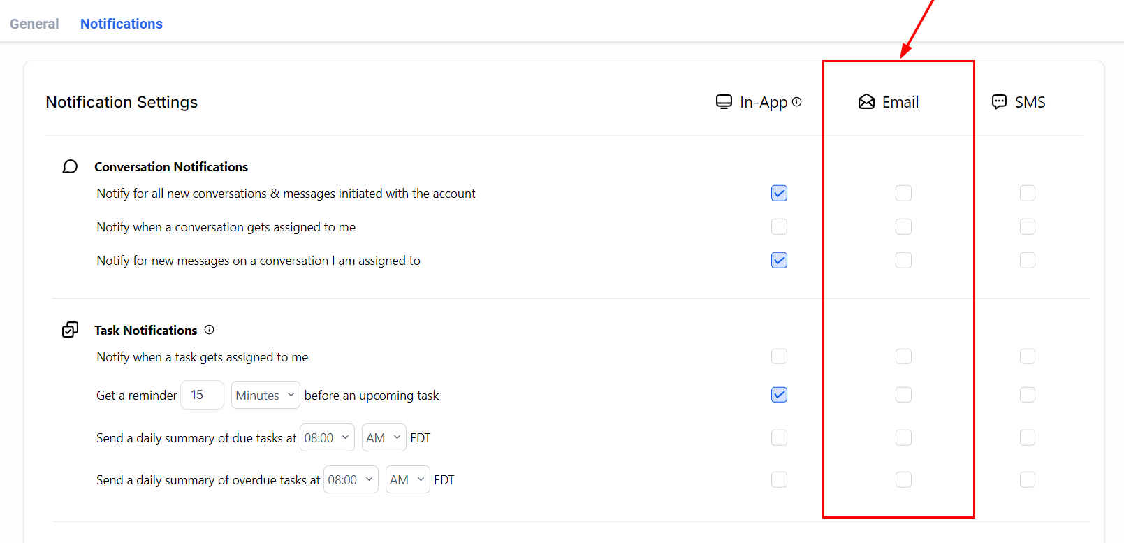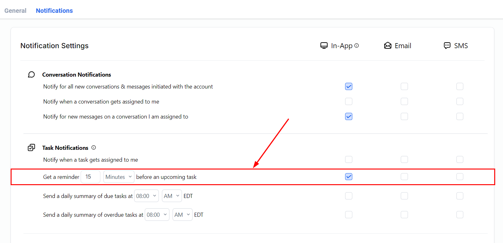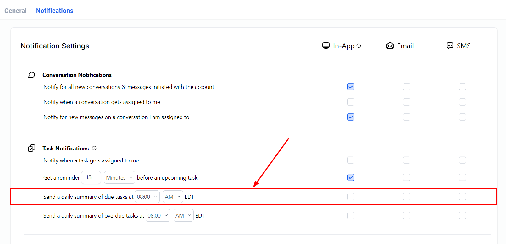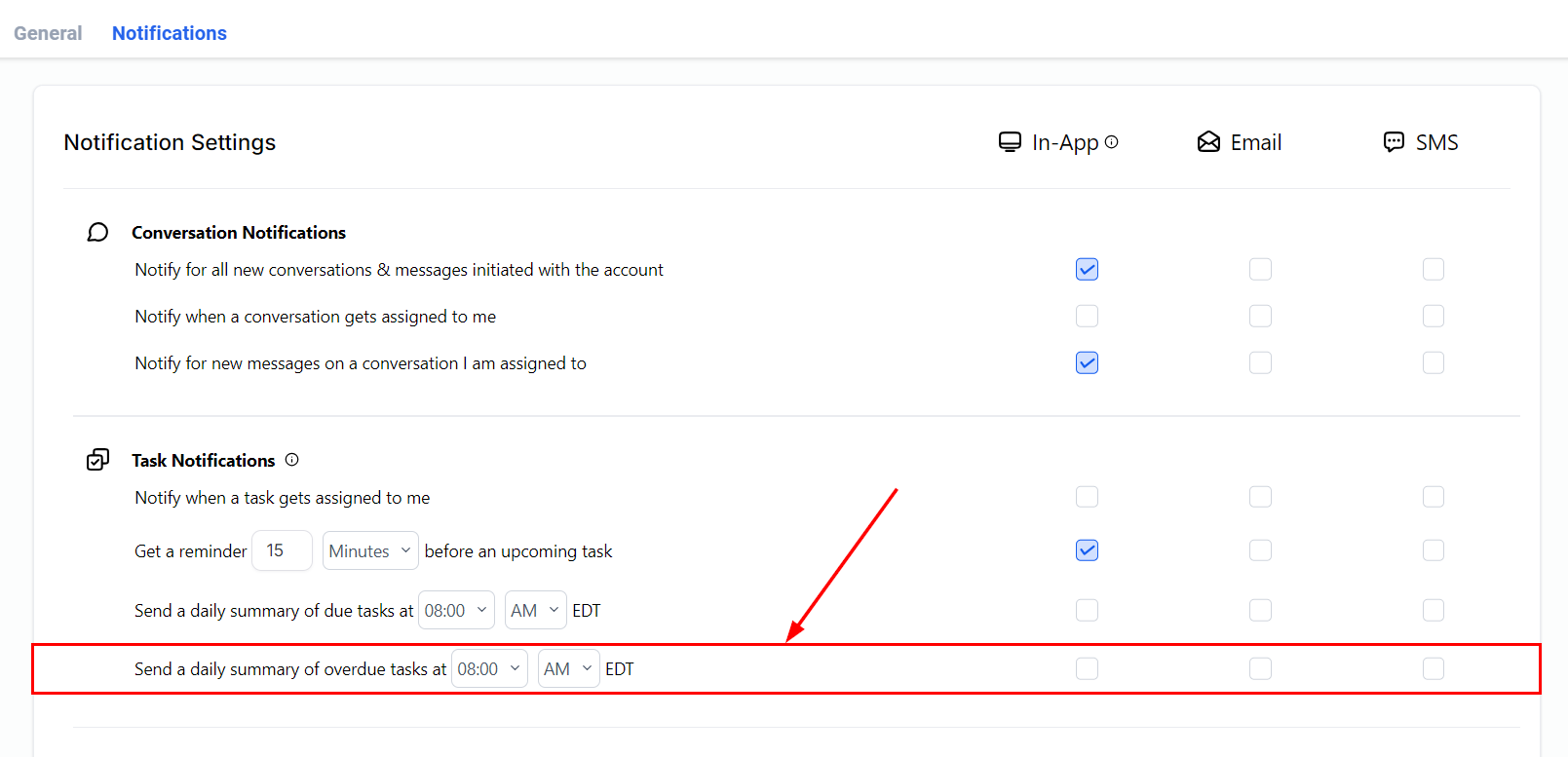 Here, you can adjust your notification settings to manage conversations, tasks, or social media updates.