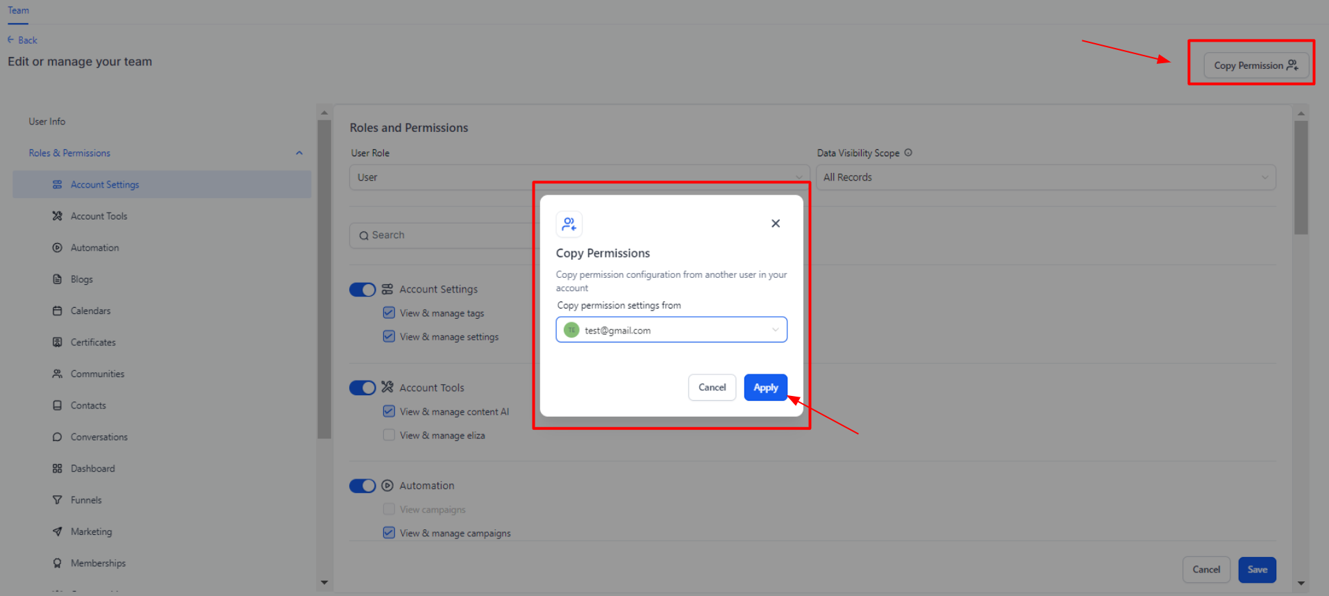Once you've set the permissions for any user you can click on Copy Permission to reuse them in others. After clicking the button, select the user you want to copy them to and click apply.