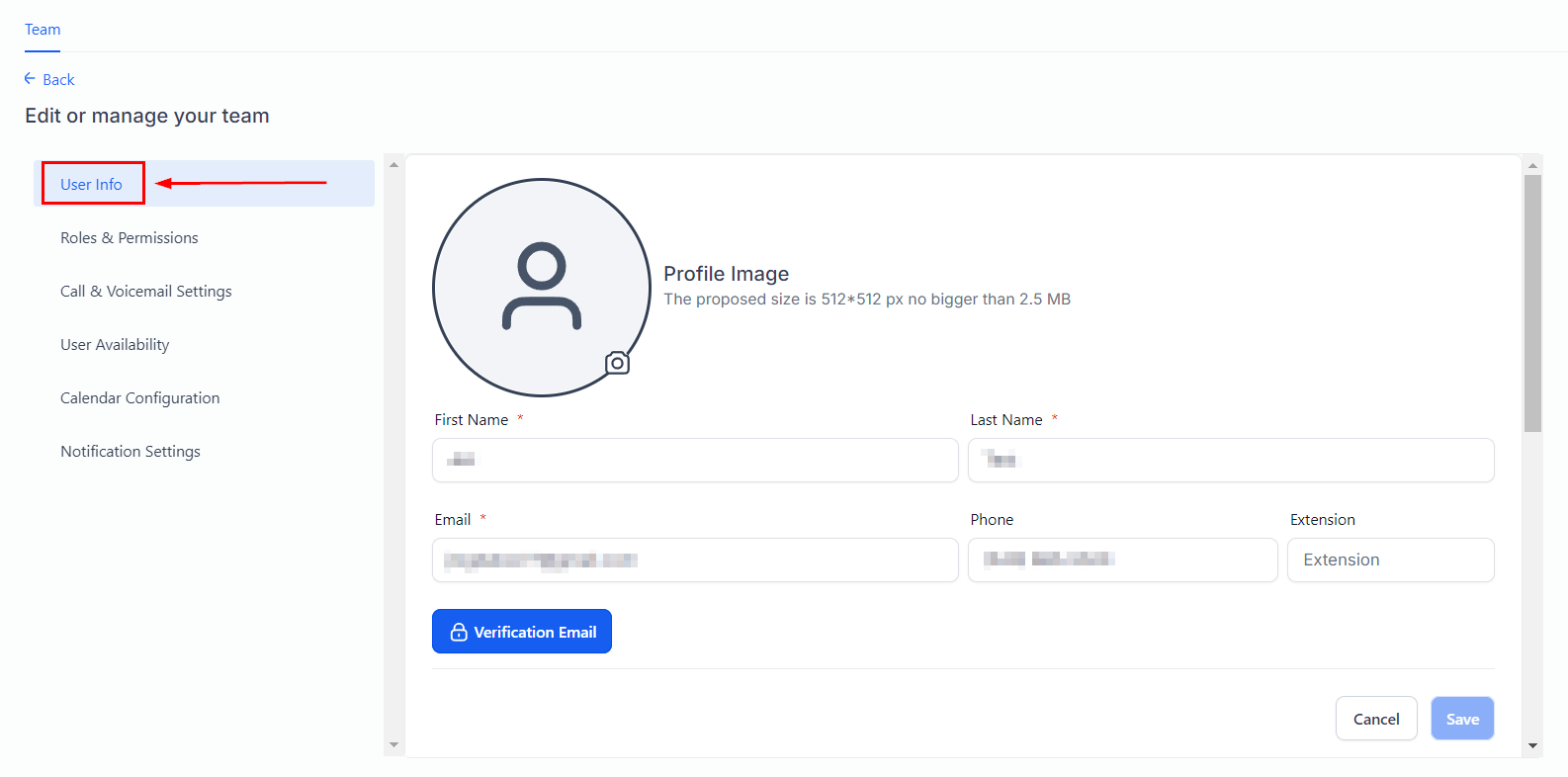 To edit a team member, click the pencil icon to the right of the contact you want to edit. A popup will appear for you to edit the contact information including user info, permissions, roles, call & voicemail settings, availability, and calendar configuration. You can also remove a team member from this location/sub-account with the crossed-out tag icon, or delete a team member with the trash can icon.