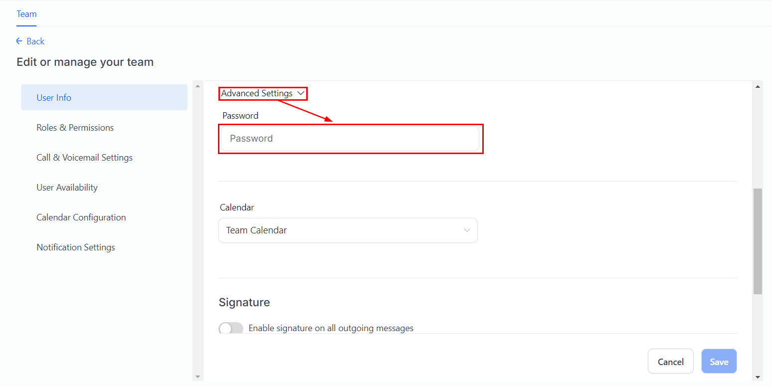 By opening advanced settings, you can set and reset each user's passwords and assign each user a specific calendar.