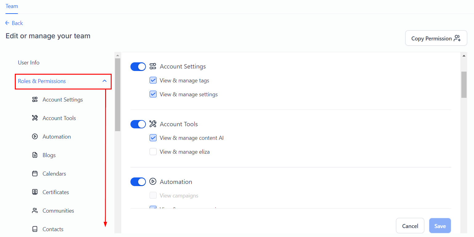 If you are the administrator, you can toggle on and off various permissions for the users within your team. Toggling options off will make sections of the CRM unviewable for team members. This option is great if you would like to limit your team members from seeing or editing sections in your CRM.