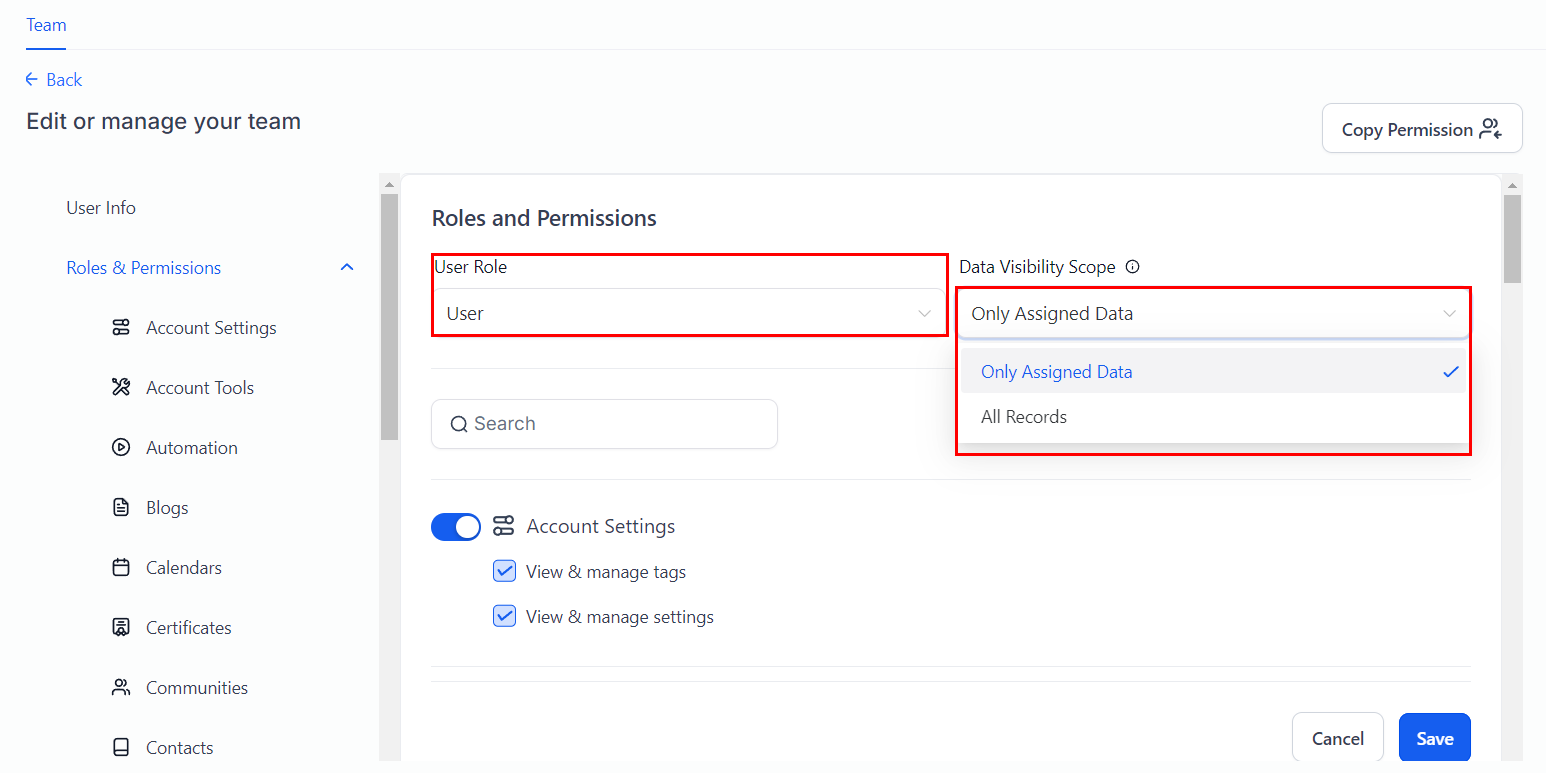 Within the User Roles section, you can designate a user as either a general user or an administrator. This allows you to manage and delegate access levels and responsibilities according to each team member's role within your organization. For users, you can use the Data Visibility Scope to limit them to only assigned data or give them access to all.