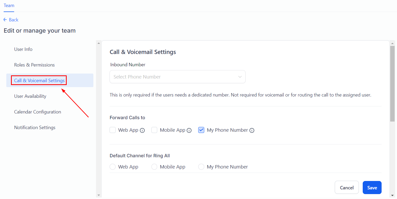 Within the Call & Voicemail Settings, you have the flexibility to configure an incoming call timeout duration and upload an MP3 or WAV file to serve as the user's voicemail greeting.