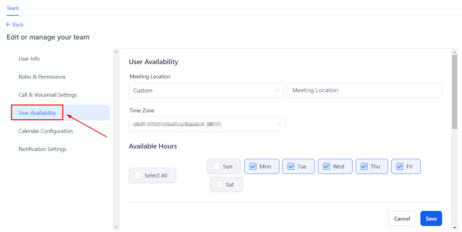 In the User Availability section, you can set the team member's calendar availability for meetings. Choose a meeting location from the dropdown.