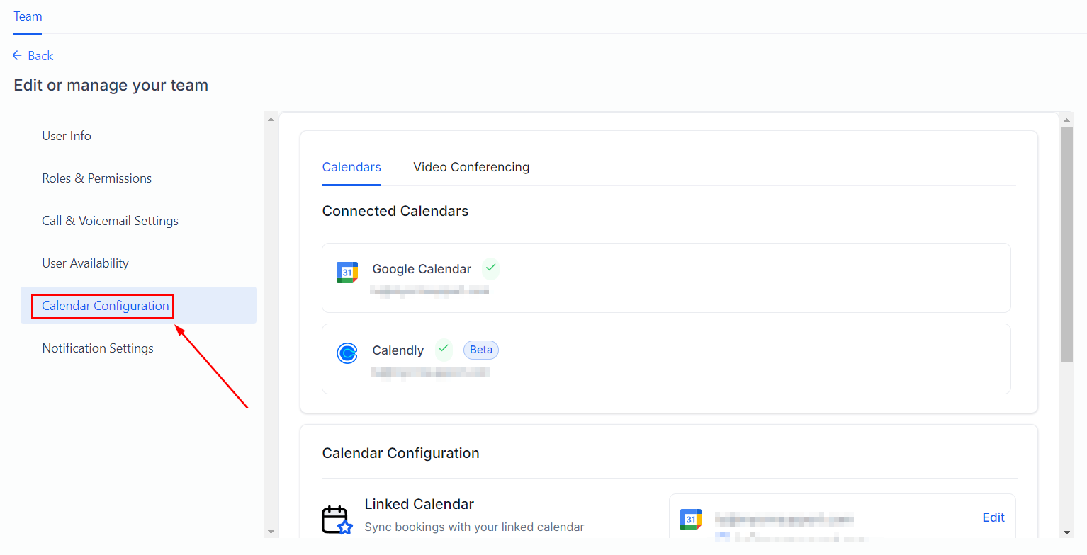 Under Calendar Configurations, you can select a Calendar or Video Conferencing account for the team member. This will be used for scheduling purposes. As well as pick additional calendars to check for scheduling conflicts.