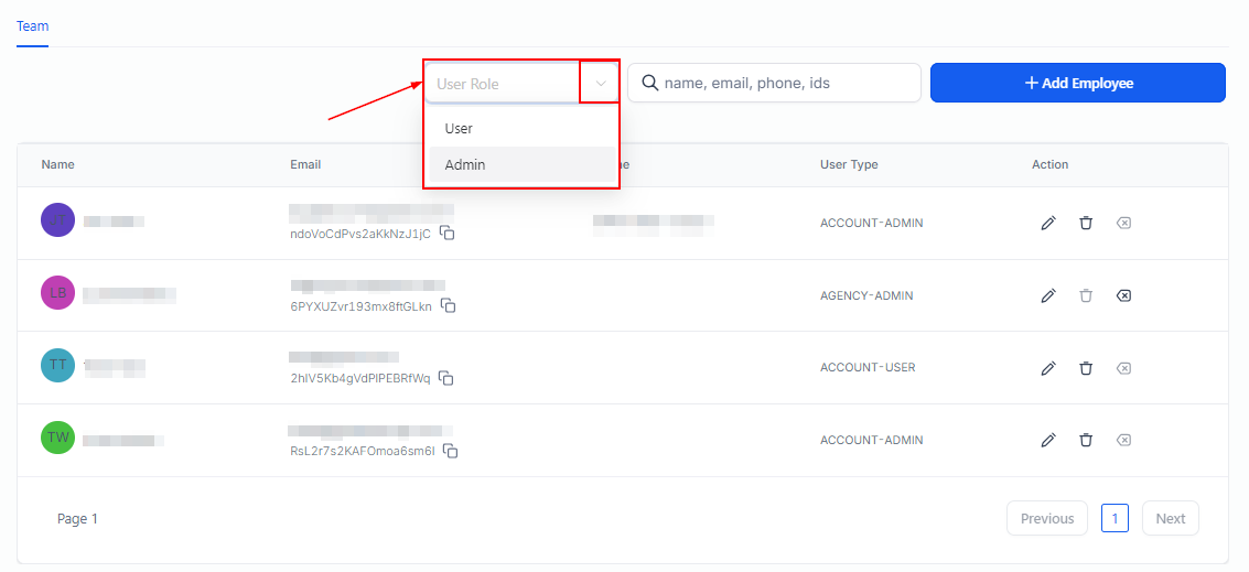 To sort the list based on user roles, simply click on the Role dropdown menu and choose your desired view: all, user, or admin. Upon selection, the list will automatically update to display the corresponding group of team members according to the role you've chosen, making it easier to manage and identify specific individuals within your organization.