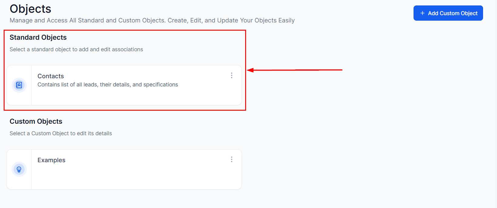 To create custom labels for Contacts, go to Settings > Objects, then click on the Contacts standard object.