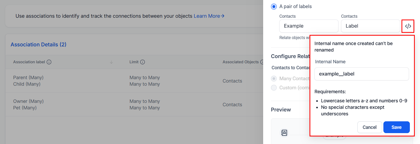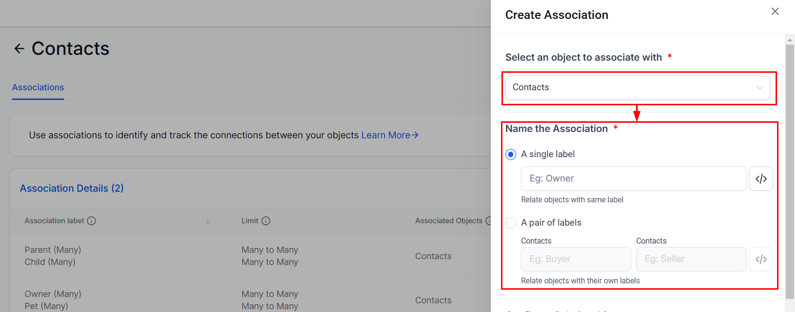 Select the contact object to associate, then choose either a single label or a pair of labels and give them a name.