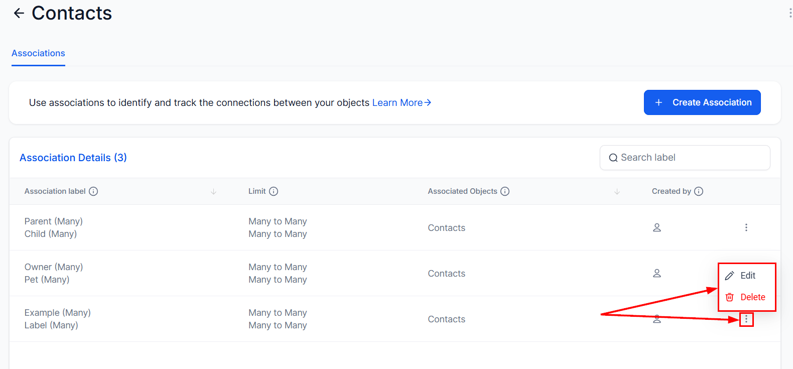 The association labels will then be displayed in the Contacts Association list and can be edited or deleted through the three-dot action menu.