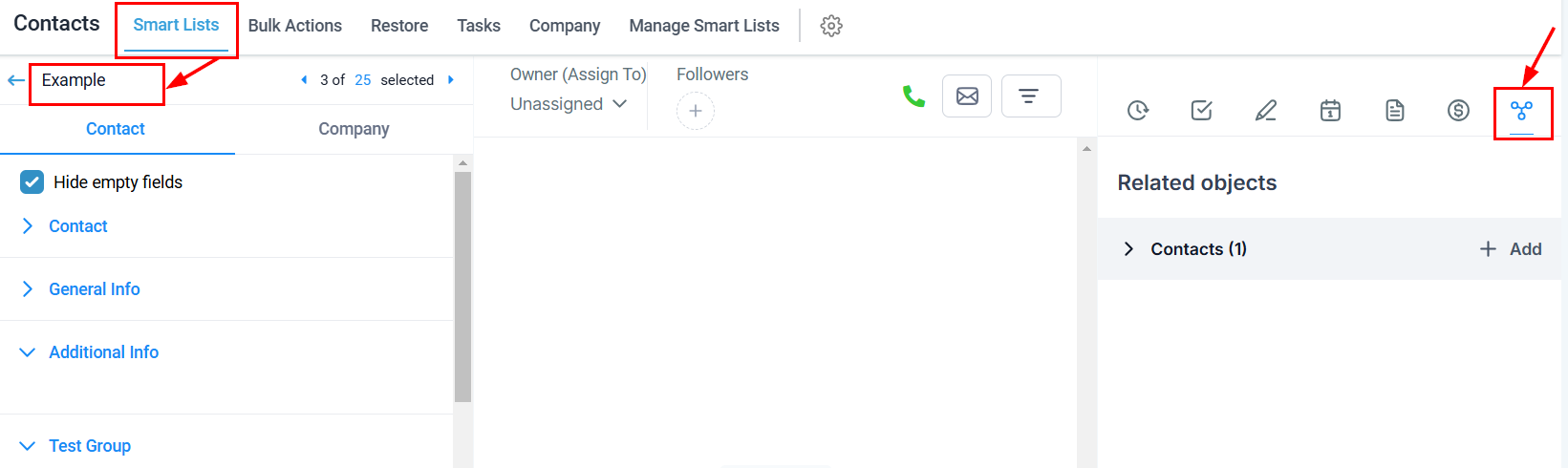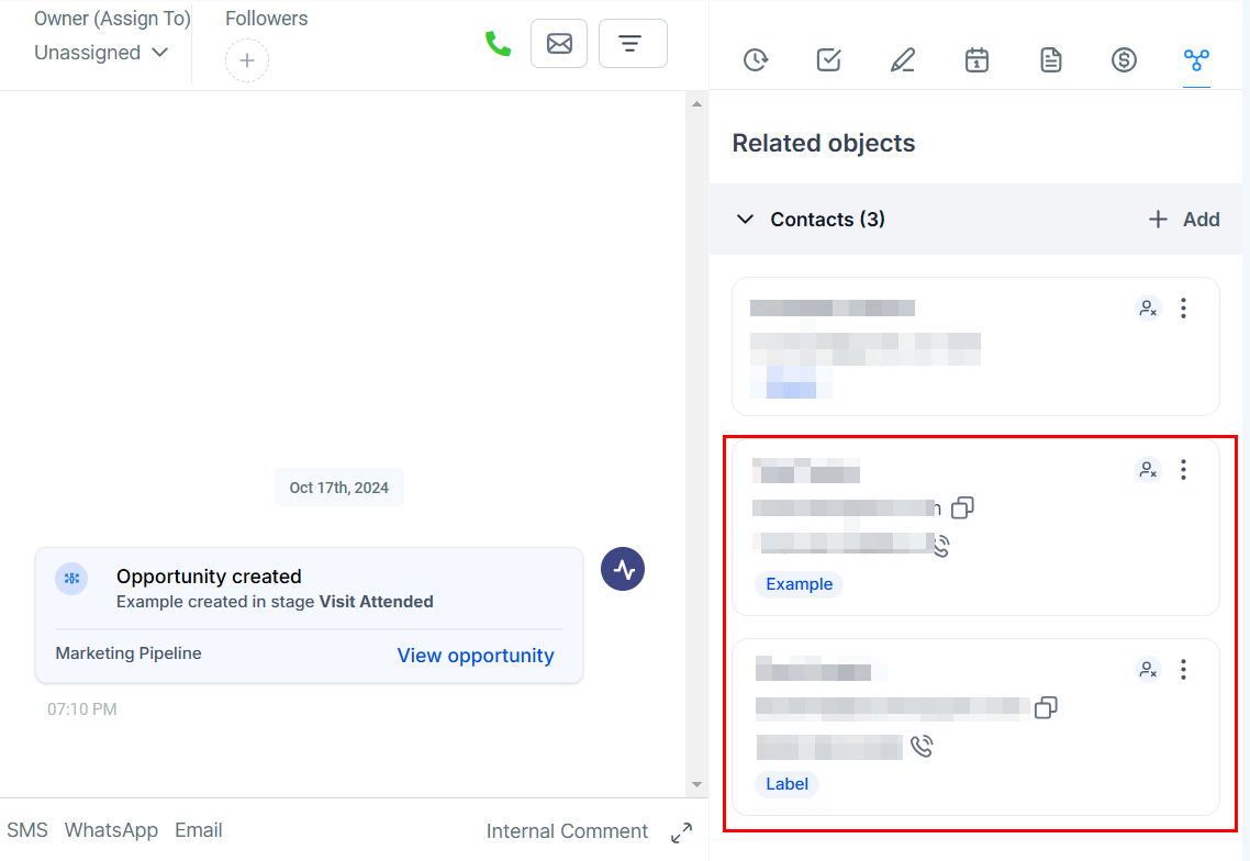 View Linked Contacts: A dedicated section within the contact details view displays all linked contacts, grouped by their association labels, providing a clear overview of related contacts.