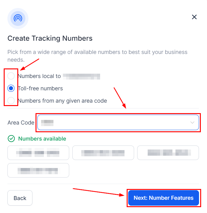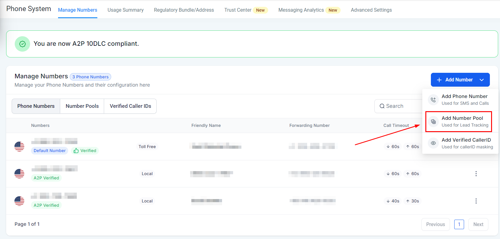 Set up a number pool to track call metrics such as duration, caller ID, and call source. To do so click on + Add Number then select Add Number Pool.