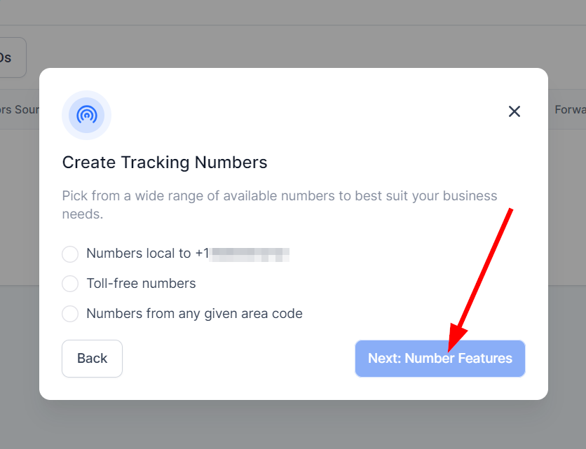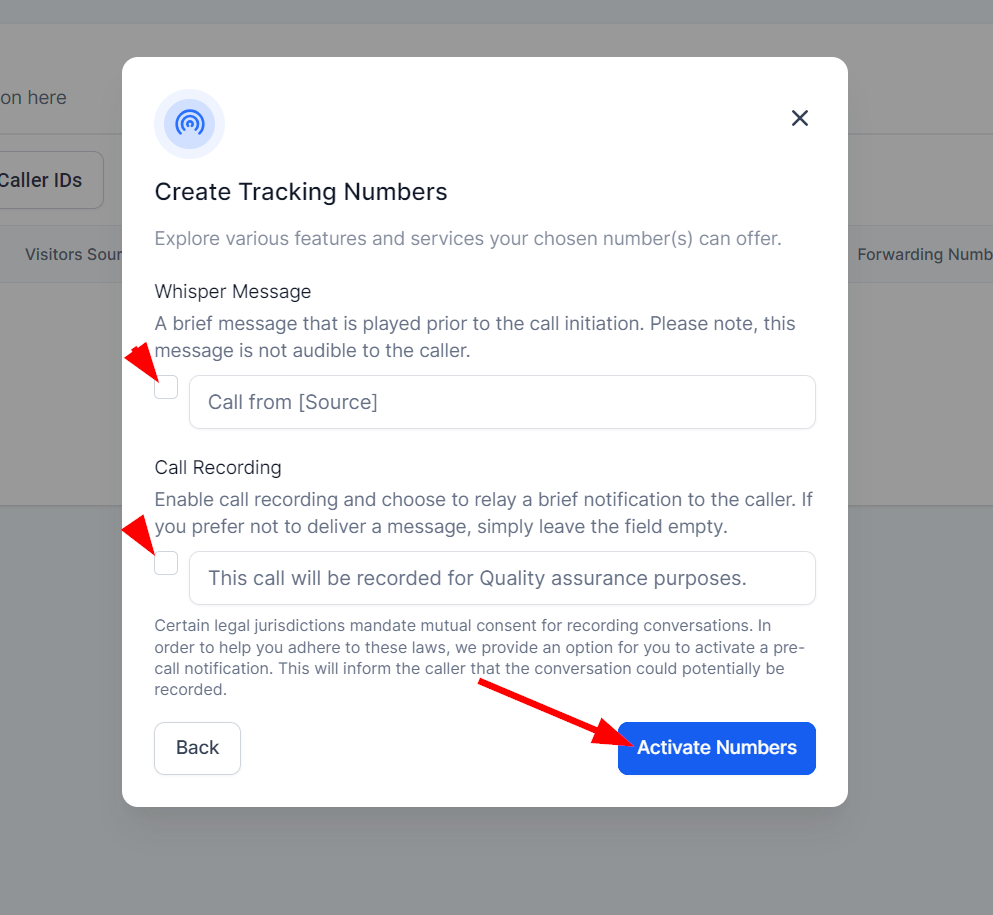 Select Phone Numbers: Choose from local or toll-free numbers and add a whisper message or call recording if desired.