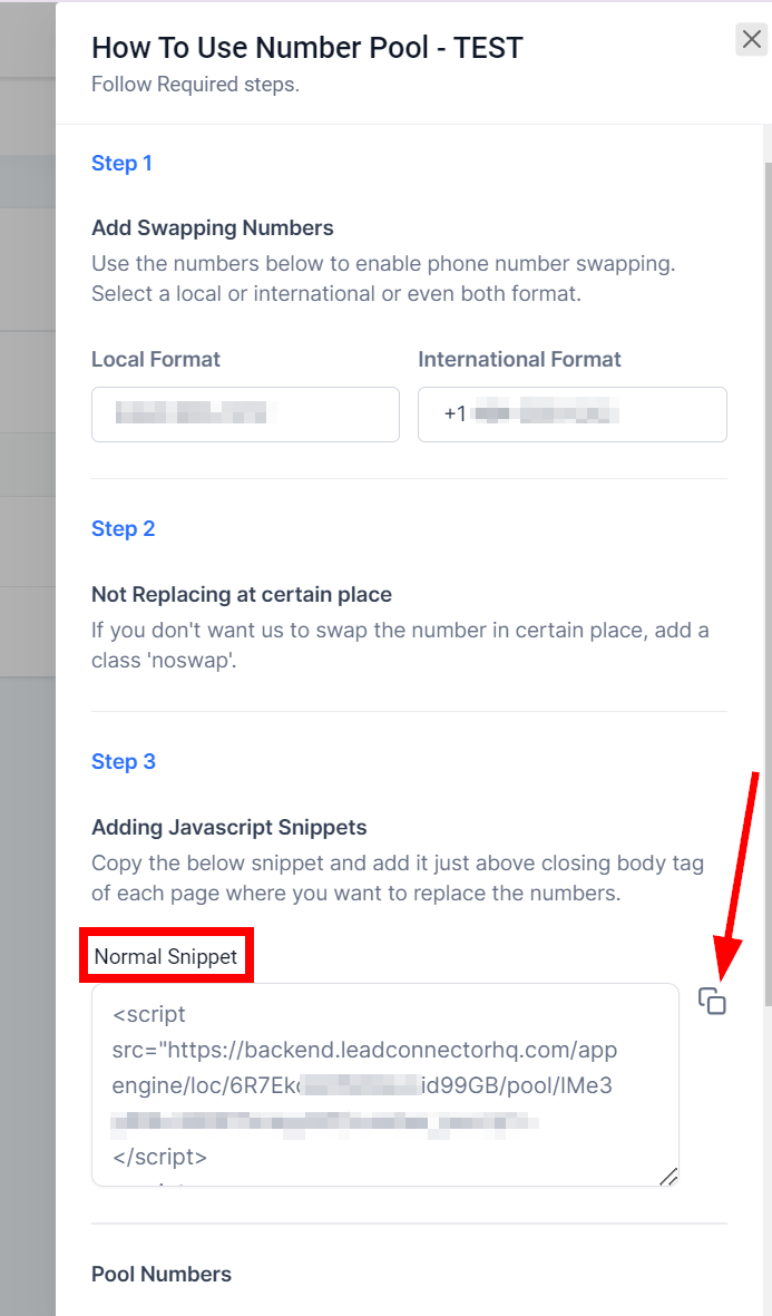 Copy Snippet: After setting up the number pool, click on the information icon to access the integration snippet. Copy this snippet.
