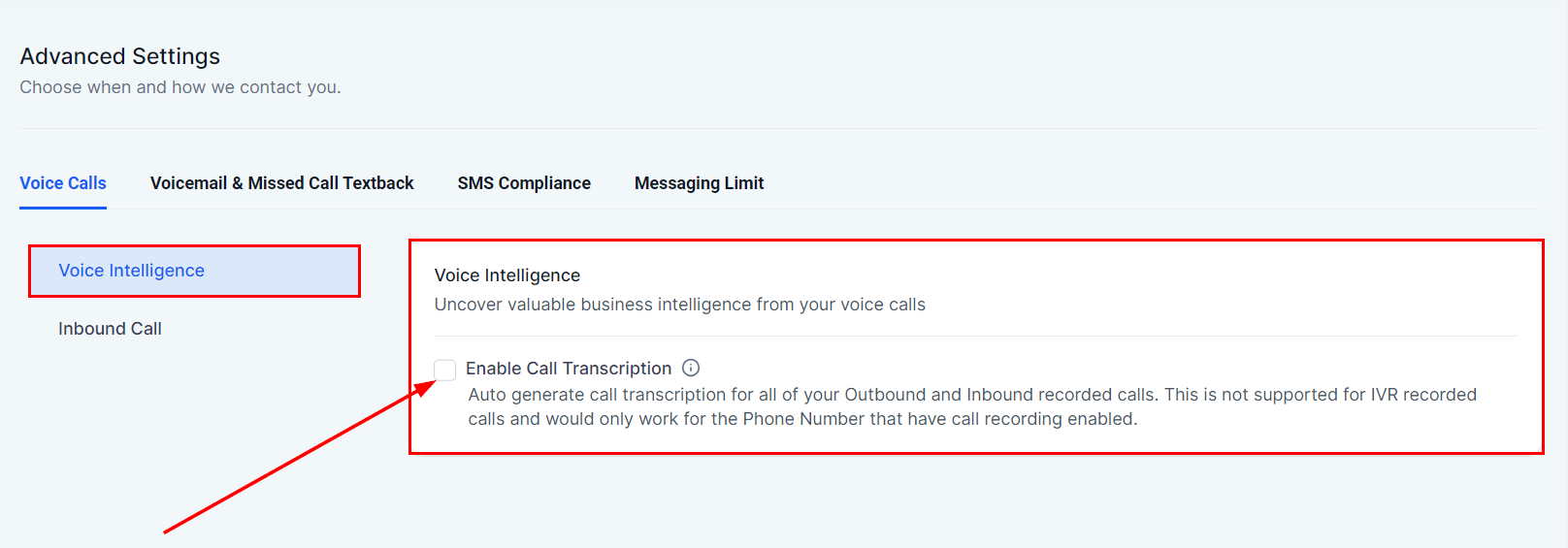Solution: Ensure that call transcription is enabled in the advanced settings under the voice calls tab.