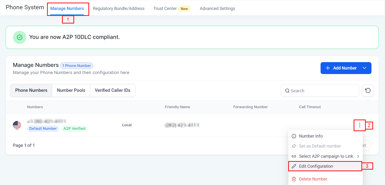 Edit Phone Number Configuration: In the 'Phone Numbers' tab, select the three dots beside the number you wish to configure and select 'Edit Configuration'.