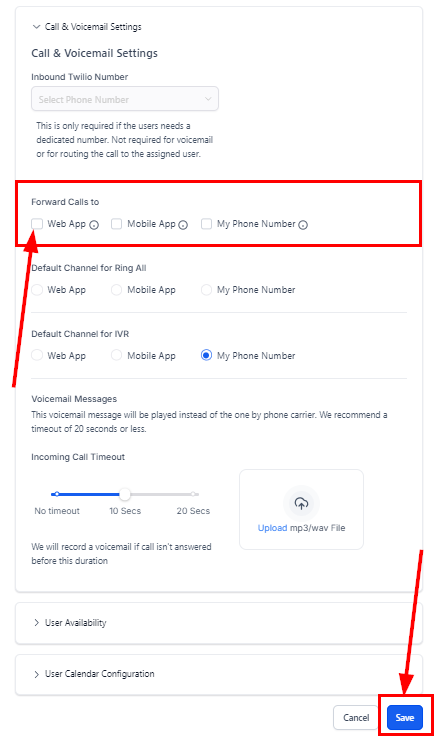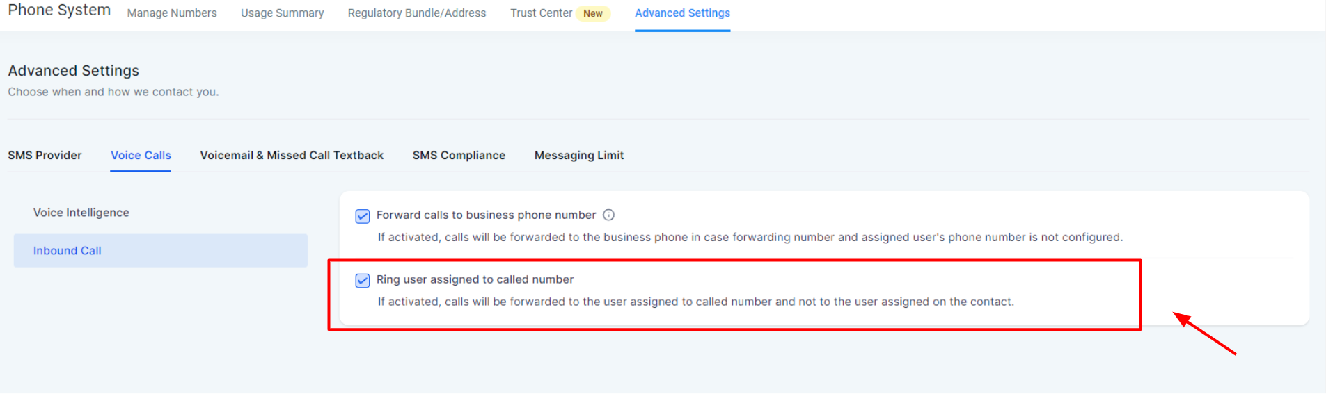 3- Check the boxes for the incoming call to go to the contact's assigned agent, if unchecked the call will go to the agent linked to the called number instead.