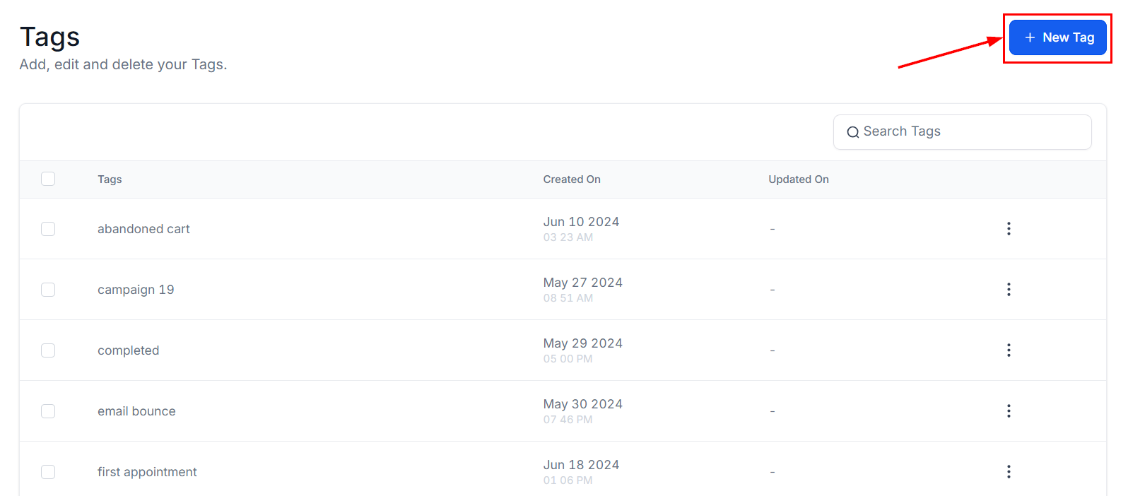 The three-dot menu on the far right of each tag entry allows you to edit or delete tags as needed.