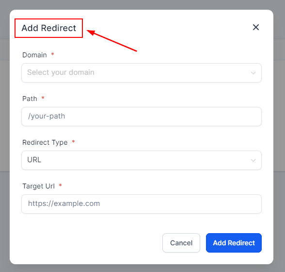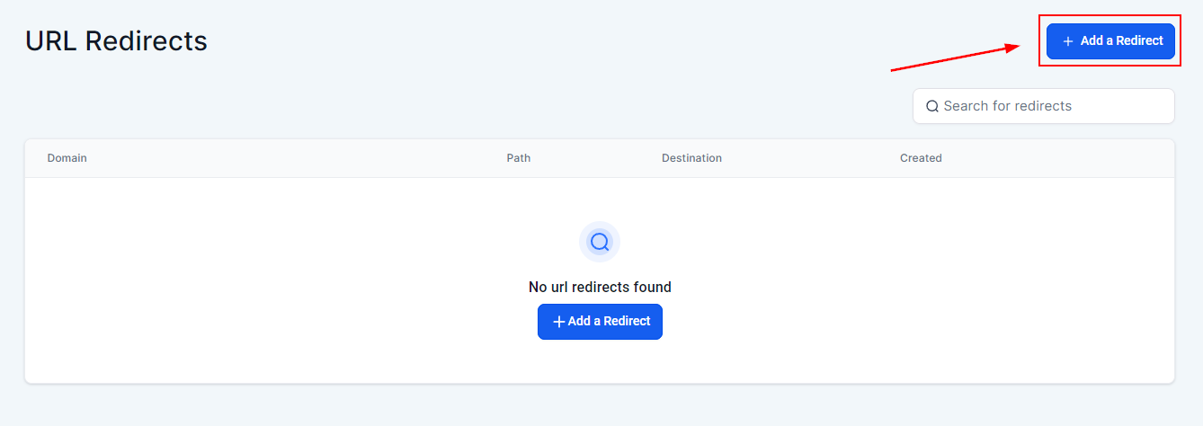 Go to your Settings and look for the URL Redirects section in your left-side menu, here click on Add Redirect. This button opens the "Add Redirect" pop-up where you can set up URL redirection.