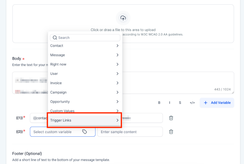 The content for the Body can include Custom Values such as contact information and trigger links, for Meta's approval you'll have to provide an example of how it would be replaced when sending.