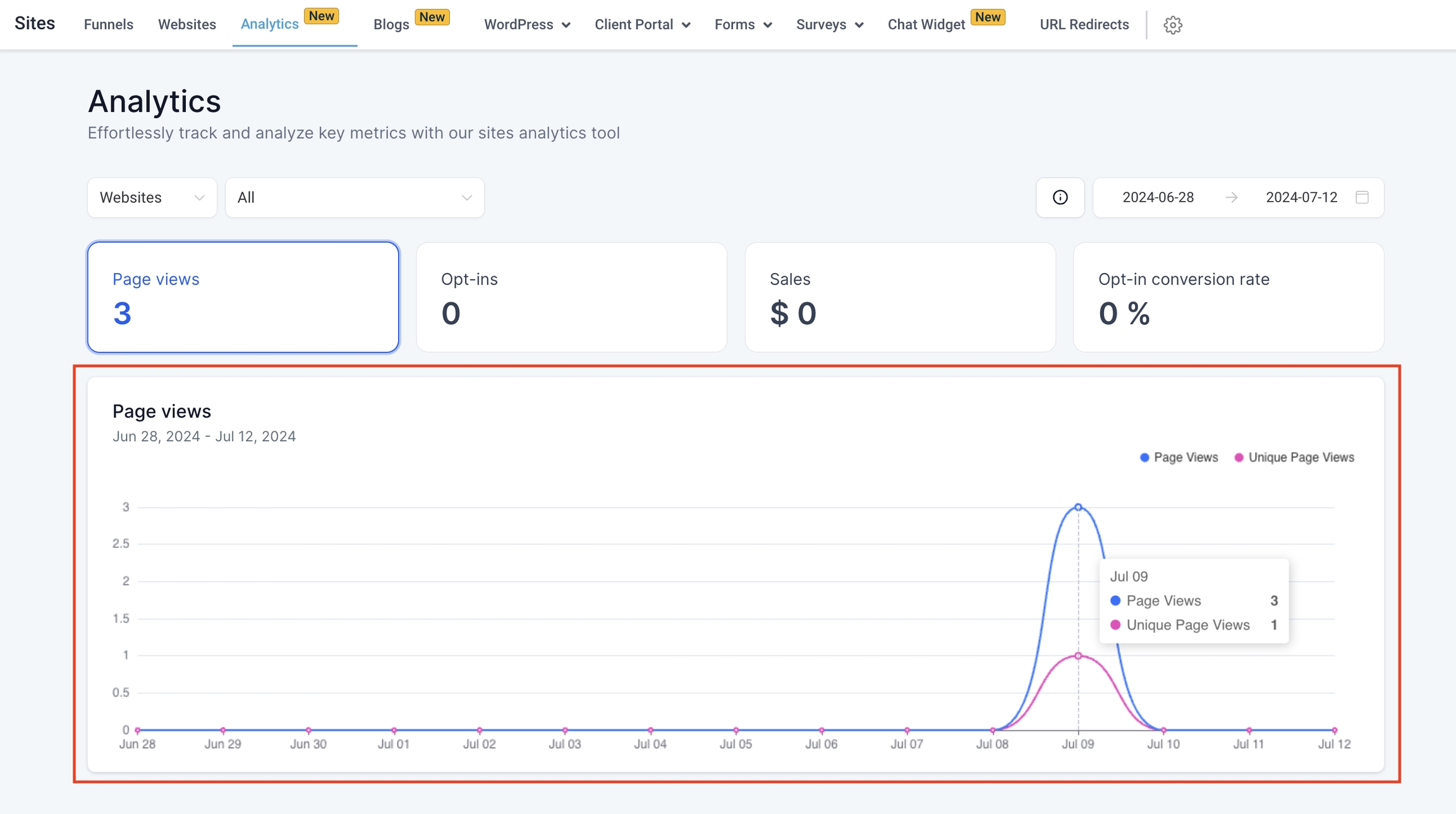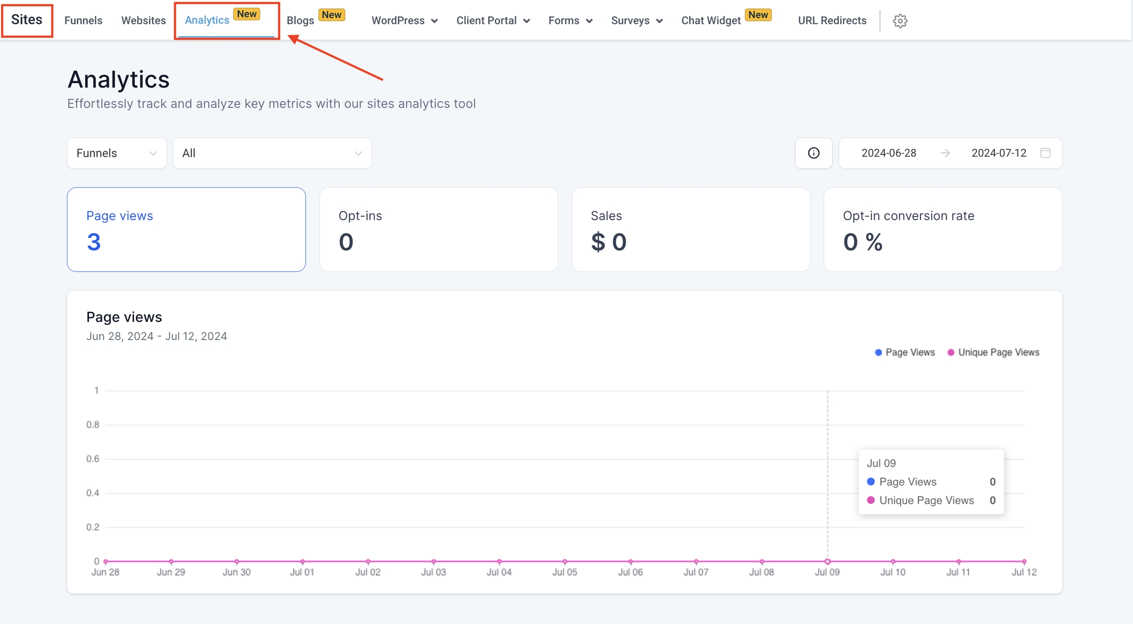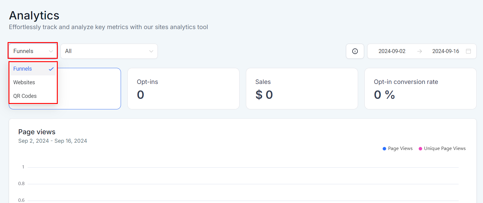Your Sites Analytics Dashboard helps you track key metrics for your funnels, websites, and QR Codes. This will help you gain a clearer picture of your page views and conversion rates among other metrics. By understanding these insights, you can spot whatβs working and what needs improvement, allowing you to make decisions to increase your online presence.