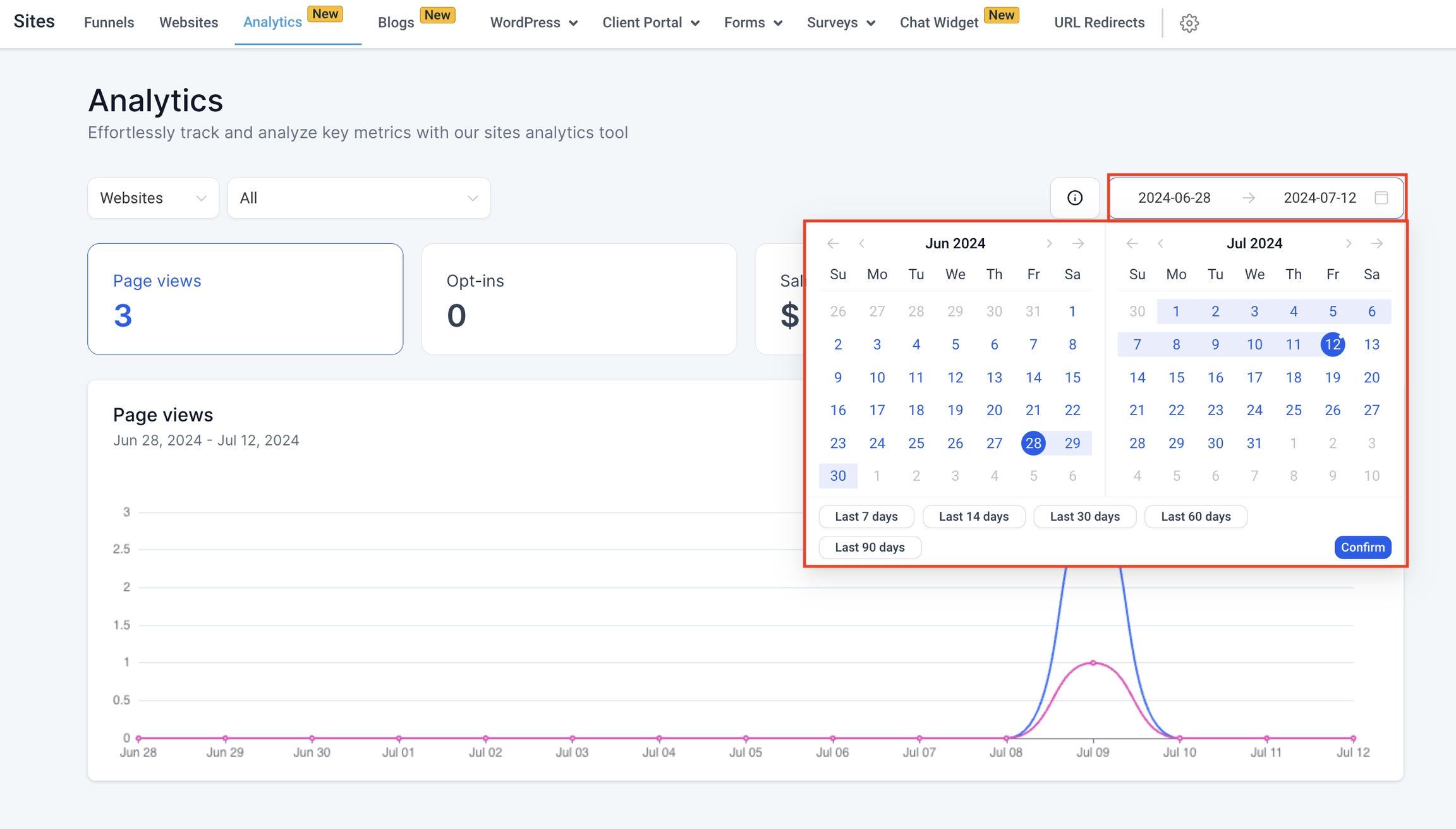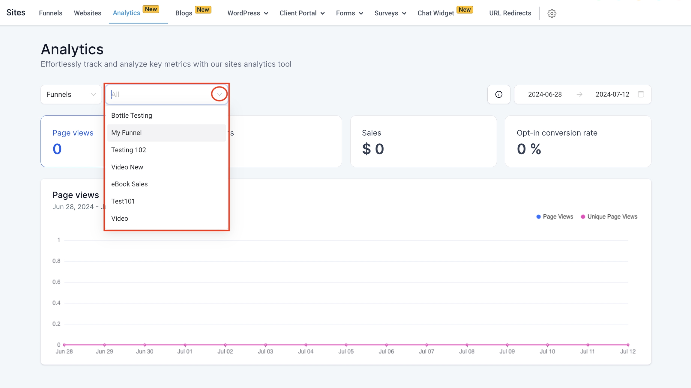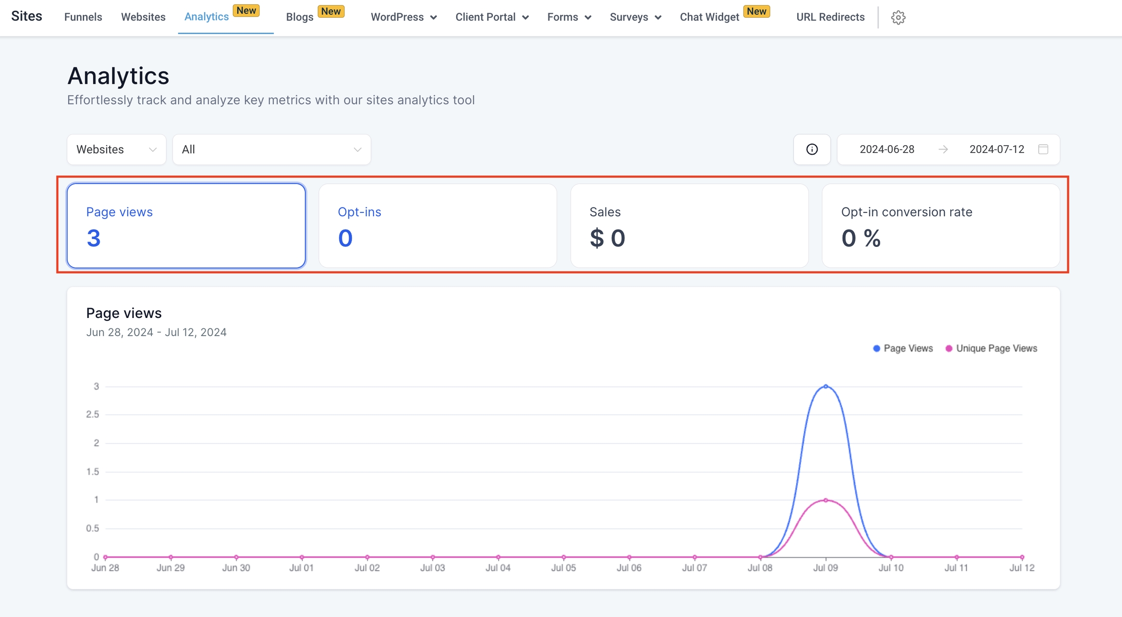 Your Sites Analytics Dashboard helps you track key metrics for your funnels, websites, and QR Codes. This will help you gain a clearer picture of your page views and conversion rates among other metrics. By understanding these insights, you can spot whatβs working and what needs improvement, allowing you to make decisions to increase your online presence.