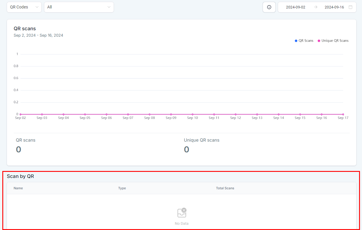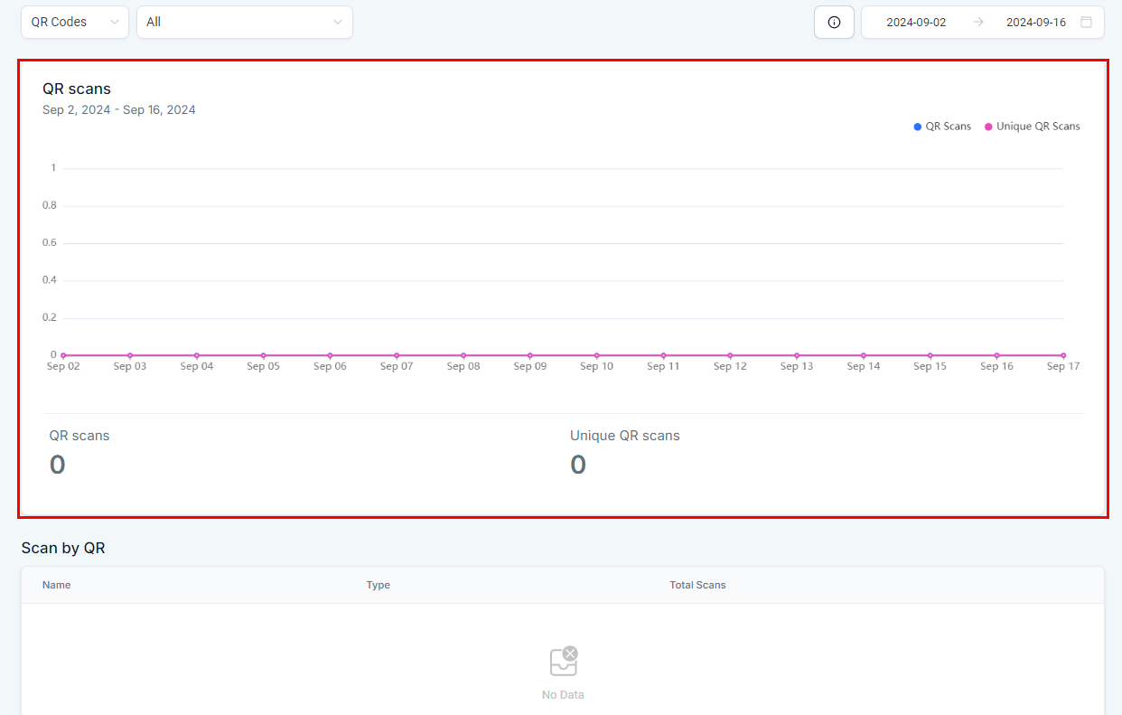 View the total number of QR code scans and the count of unique scans in the graph displayed for the selected time frame.