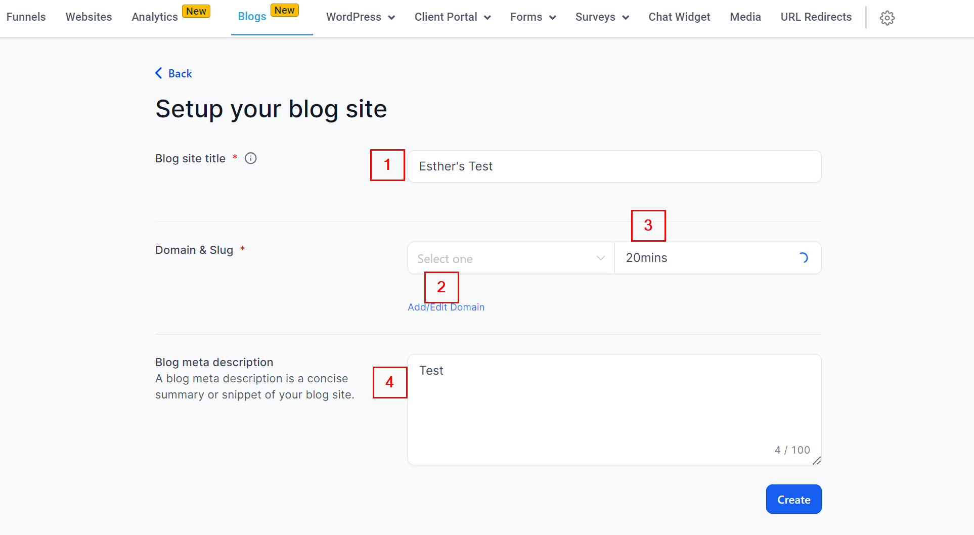 Navigate to Sites > Blogs. Click on the β+Newβ button to set up your Blog site