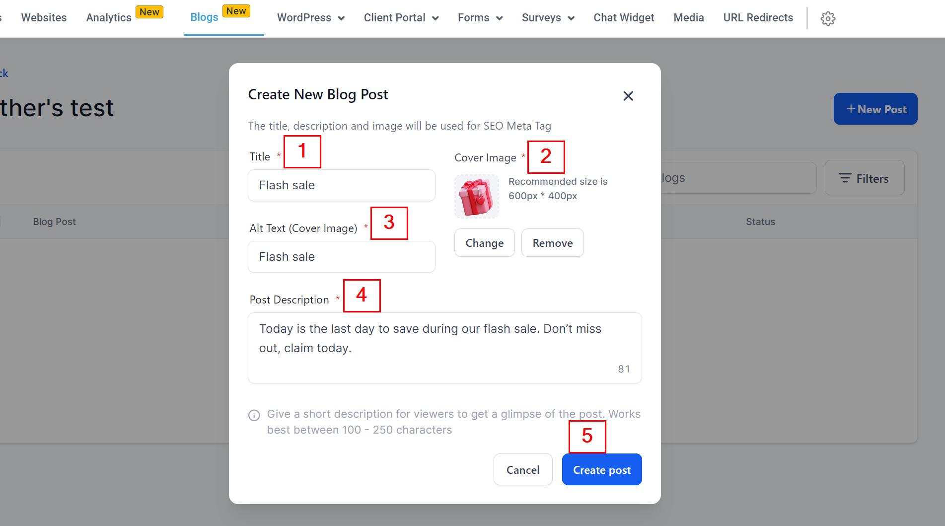 Select a Blog Post cover image. Note that the maximum image size allowed is 10MB with a recommended size of 600px * 400px.