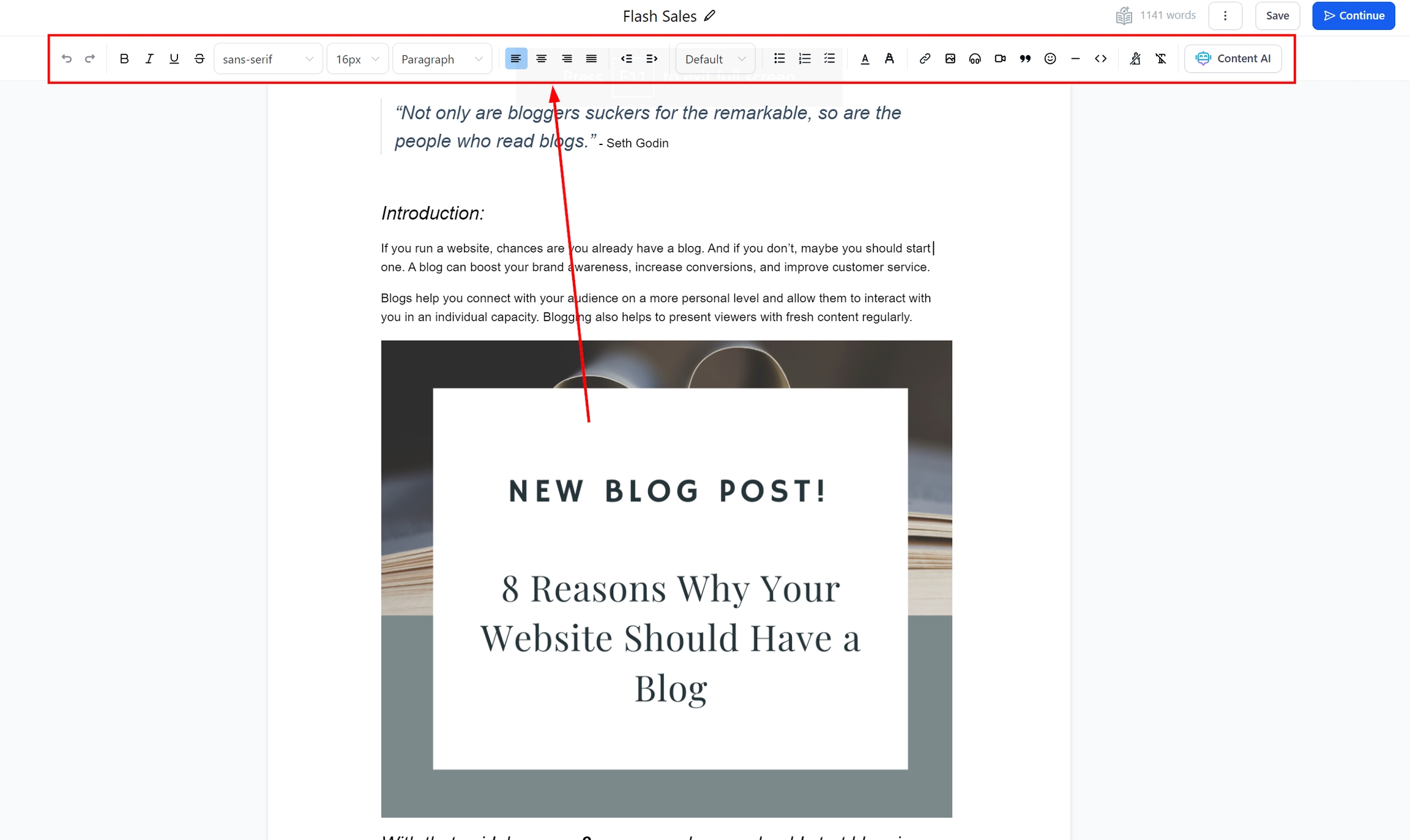 Utilize the editor toolbar to enrich your blog post. You can:Apply text styles such as bold, italics, underline, and strikethrough.Adjust fonts, styles, and sizes.Use indent, number list, bulleted list, or to-do list for organization.Add color and highlight to emphasize points.Insert images or videos from the Media Library, or YouTube, or add hyperlinks.Include quotes for specific content.Clear specific formatting or reformat the entire content.