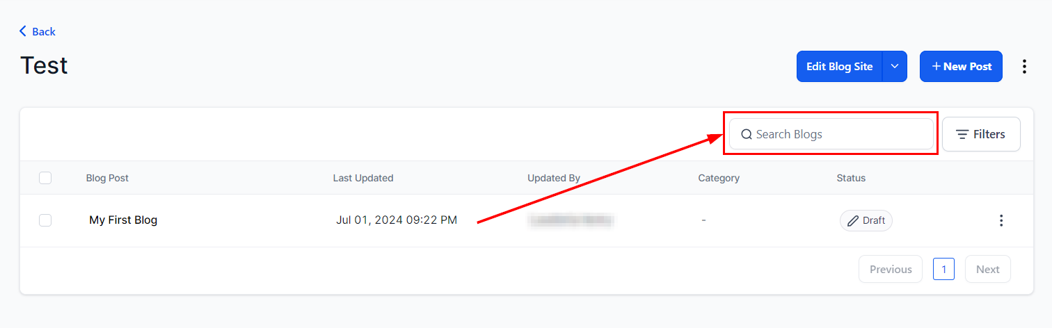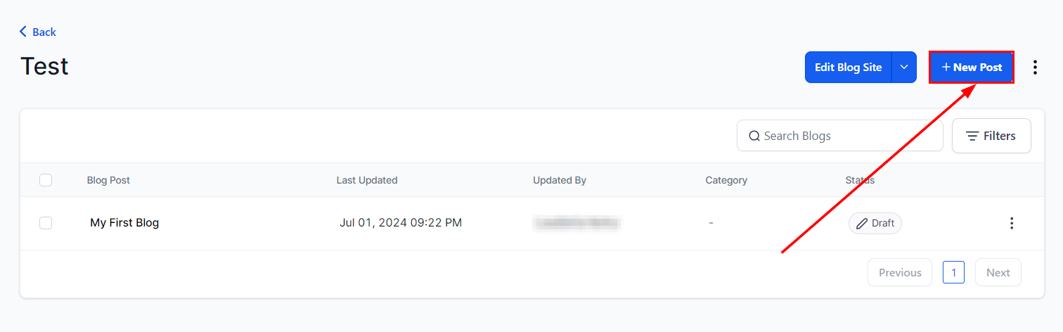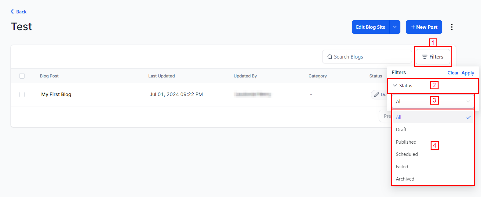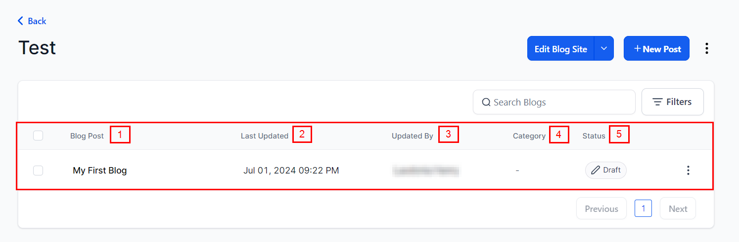 Status: Indicates whether the blog is drafted, published, or scheduled.
