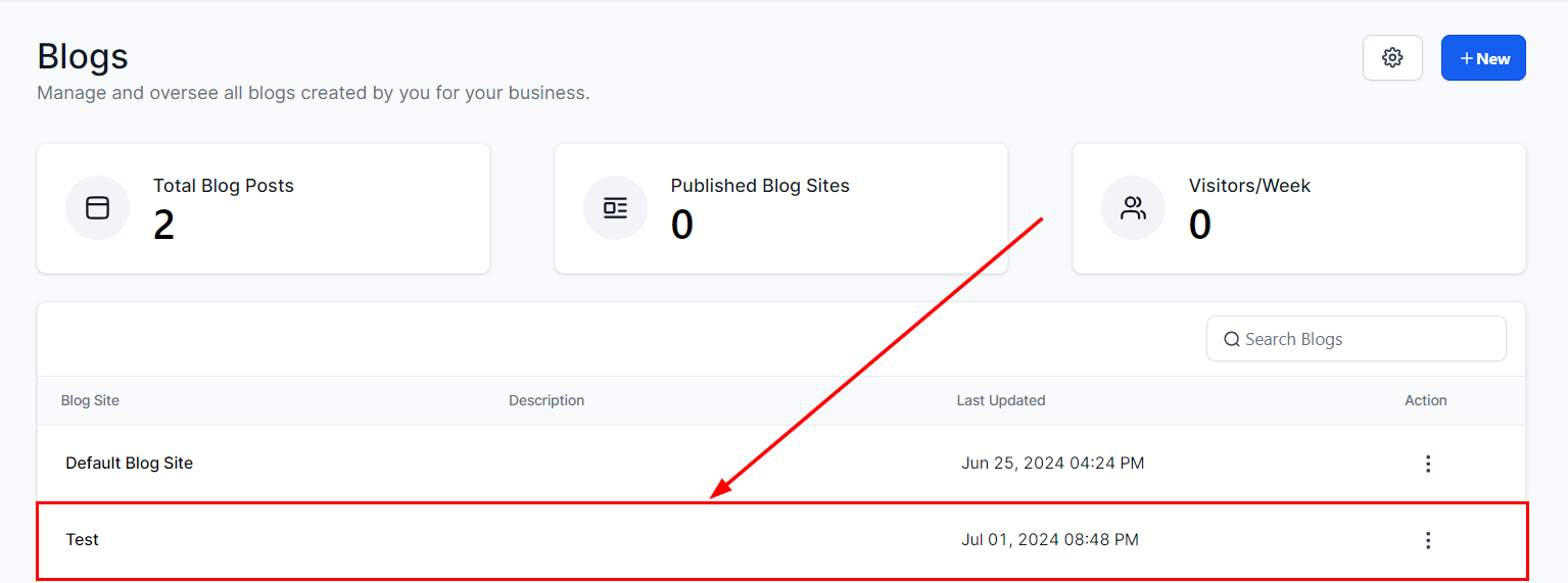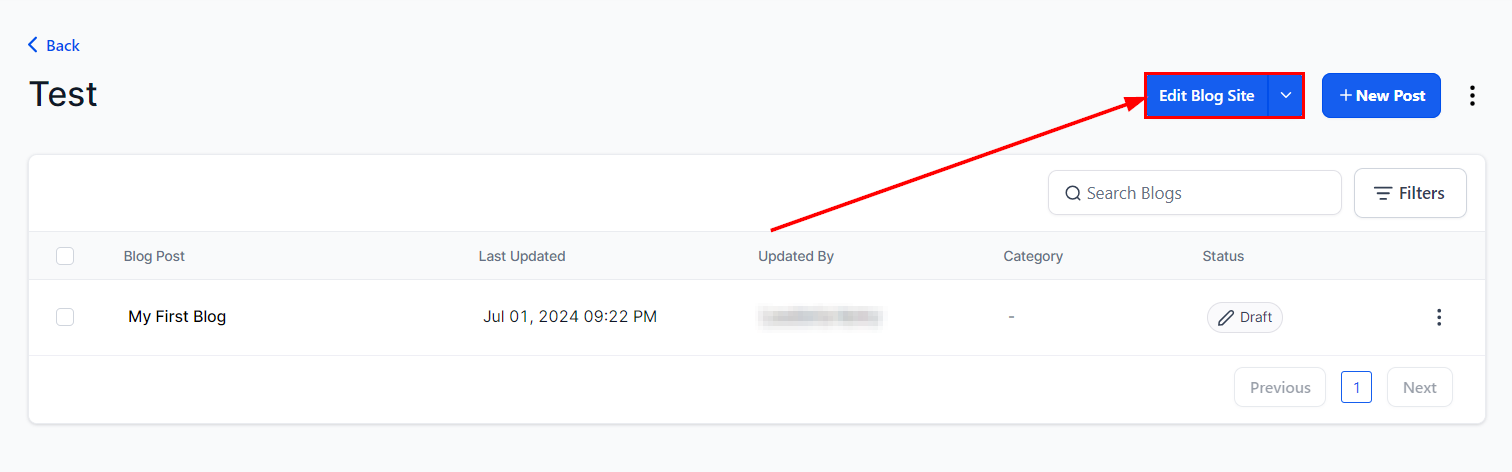 Once you have created a new Blog, you can access the Blog list by selecting the name of the Blog page from the main Blogs screen or by clicking the back arrow on the upper left-hand corner within the Blog Builder.