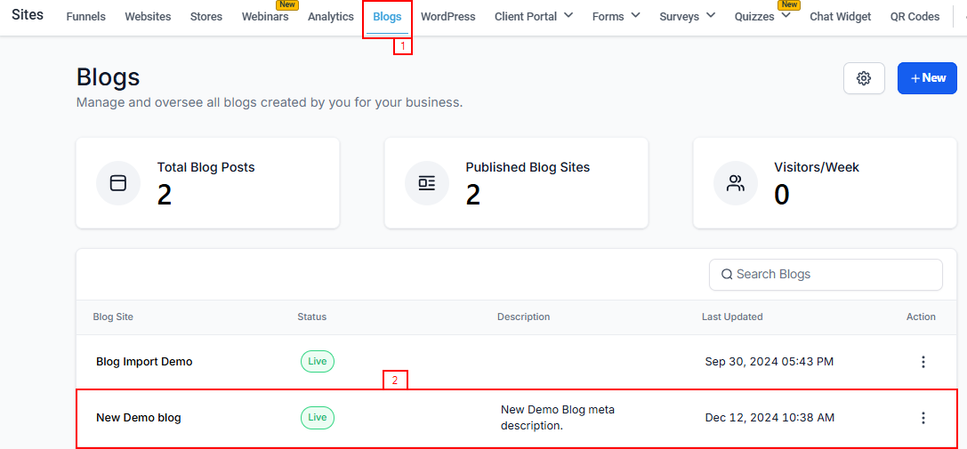 To get started, go to Sites > Blogs. Choose the blog you want to publish on.