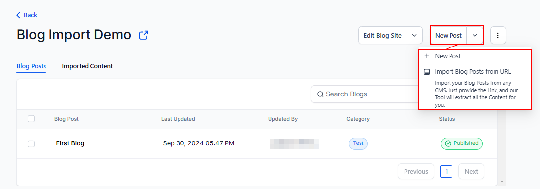Then click the New Post button to continue. In the dropdown, you can find the option to Import Blog posts from URLs (From any CMS).